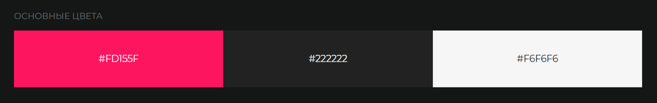 Основные цвета — темно-серый (#222222), светло-серый (#F6F6F6), розовый (#FD155F). Первые два оттенка придают дизайну требуемую фоновую строгость, а легкость визуального восприятия обеспечивается насыщенными розовыми акцентами.