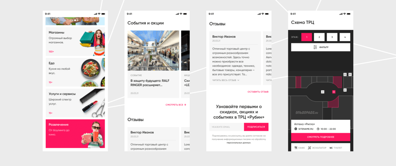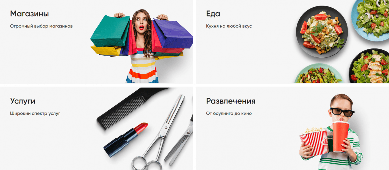 Первый экран — это своеобразная виртуальная витрина ТРЦ. Пользователь быстро оценивает внешний вид и принимает последующие решения о взаимодействии с сайтом.