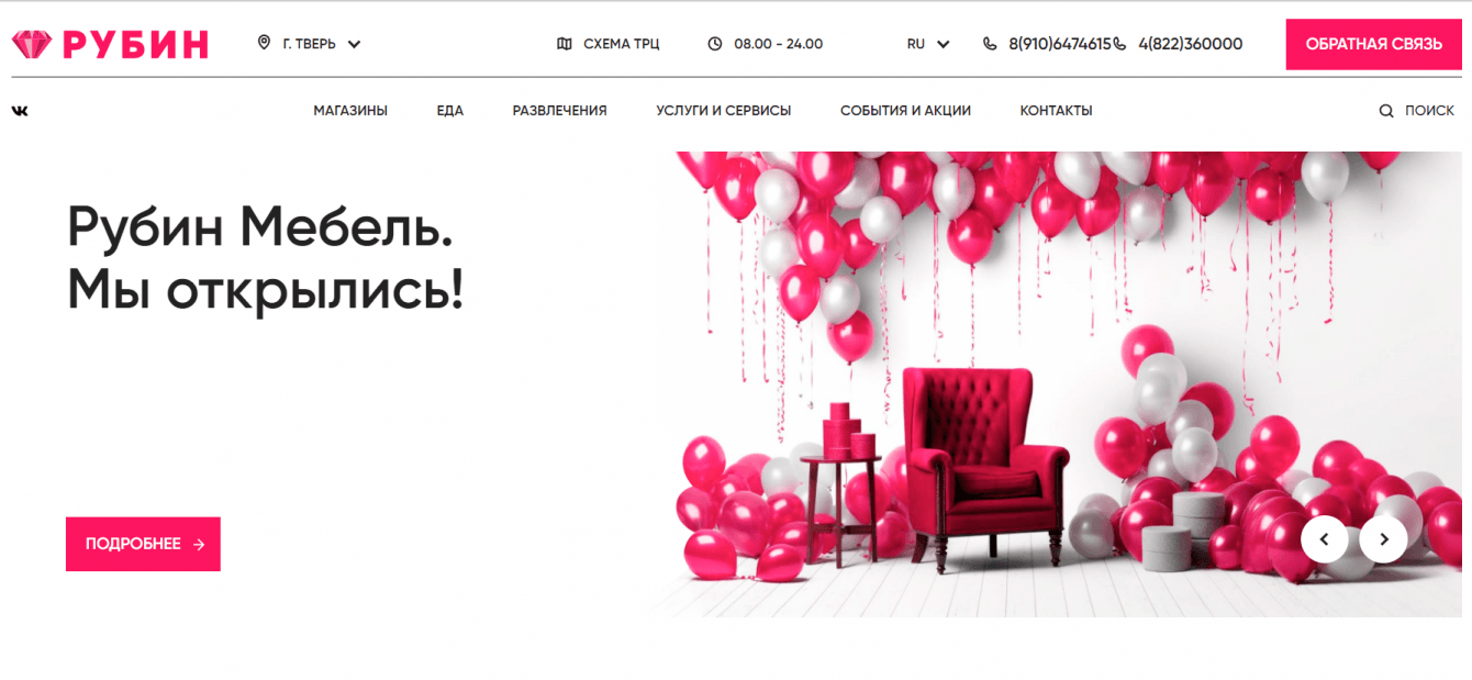 Сайт ТРЦ «Рубин» транслирует яркий дух бренда в digital-формате. Использовав четкую структуру, стильный дизайн и расширенный функционал, мы в полной мере представили преимущества торгово-развлекательного центра для посетителей.