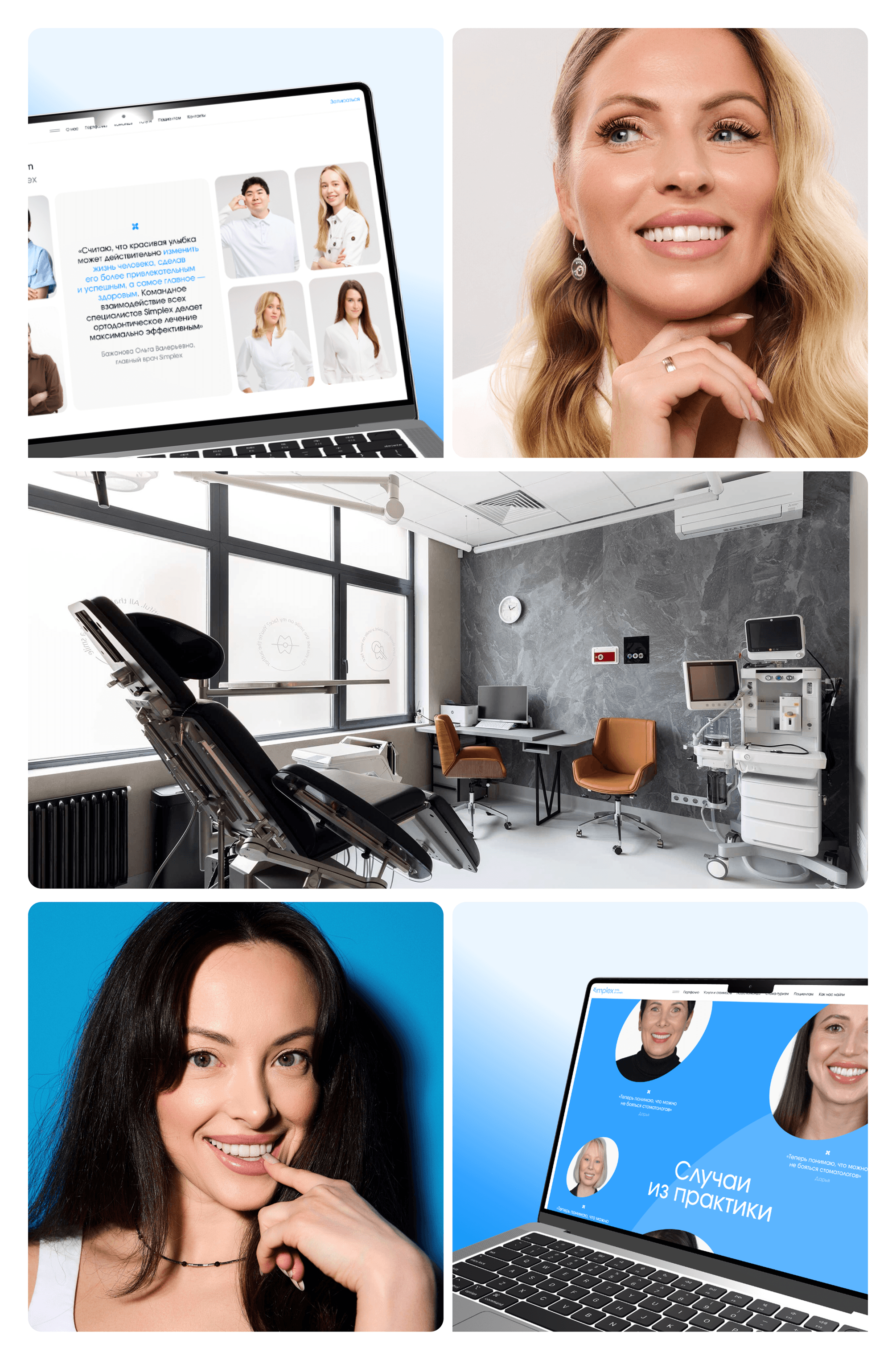 Спасибо заказчику, материалы были подготовлены безупречно. Нужные разрешения, нужные соотношения сторон и кадры. Для каждого специалиста клинки — фото, данные об образовании — дипломы, курсы повышения квалификации. Ну и, конечно, кейсы. Посмотрите несколько сайтов стоматологий в поисковой выдаче — вы поймёте, что с контентом справляются далеко не все.