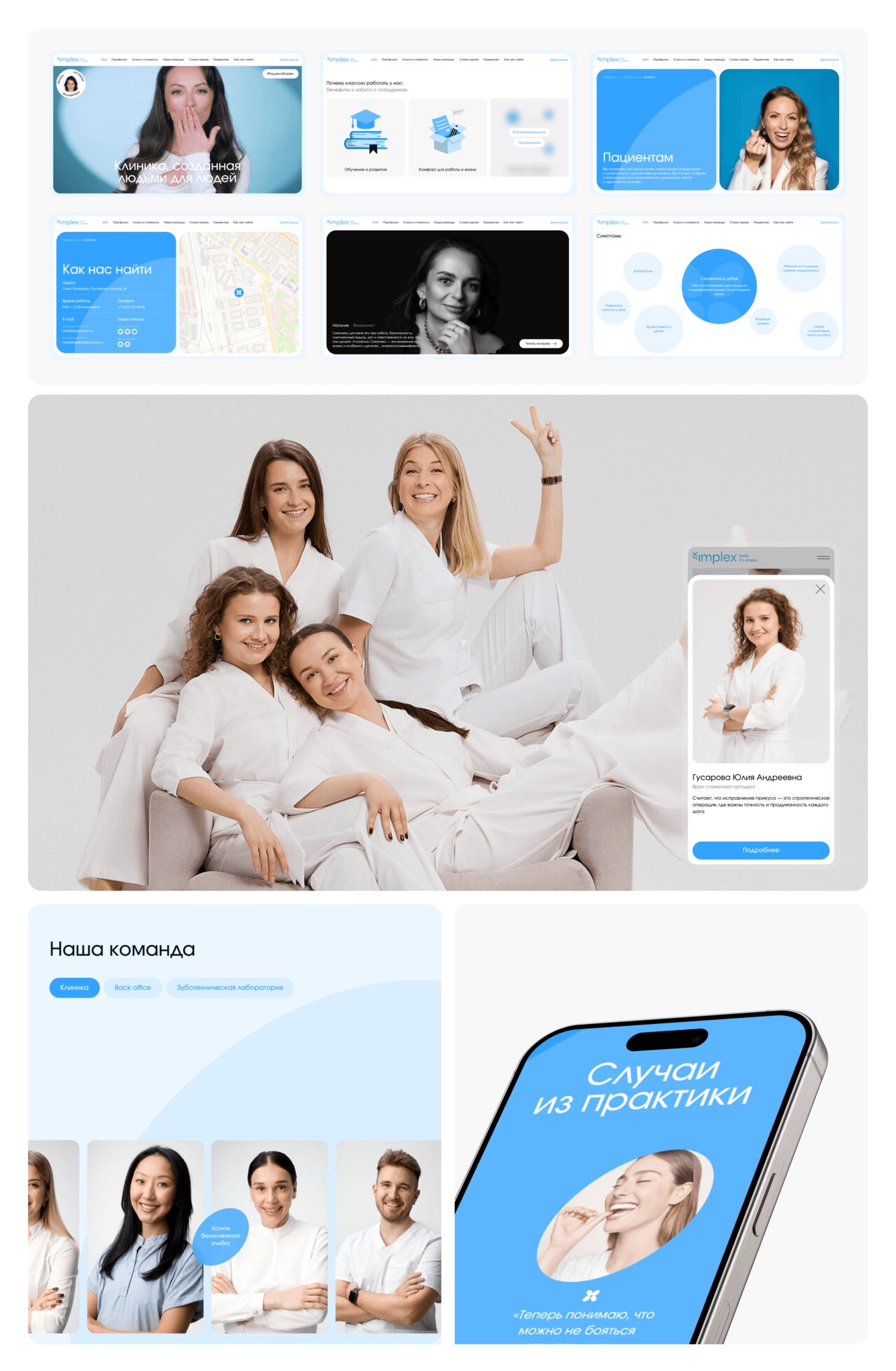 Набор страниц на сайте достаточно типовой для клиник, а вот реализация стала вызовом для наших дизайнеров! Мы придумали нестандартные сетки для расположения историй пациентов и для разделов с командой клиники.