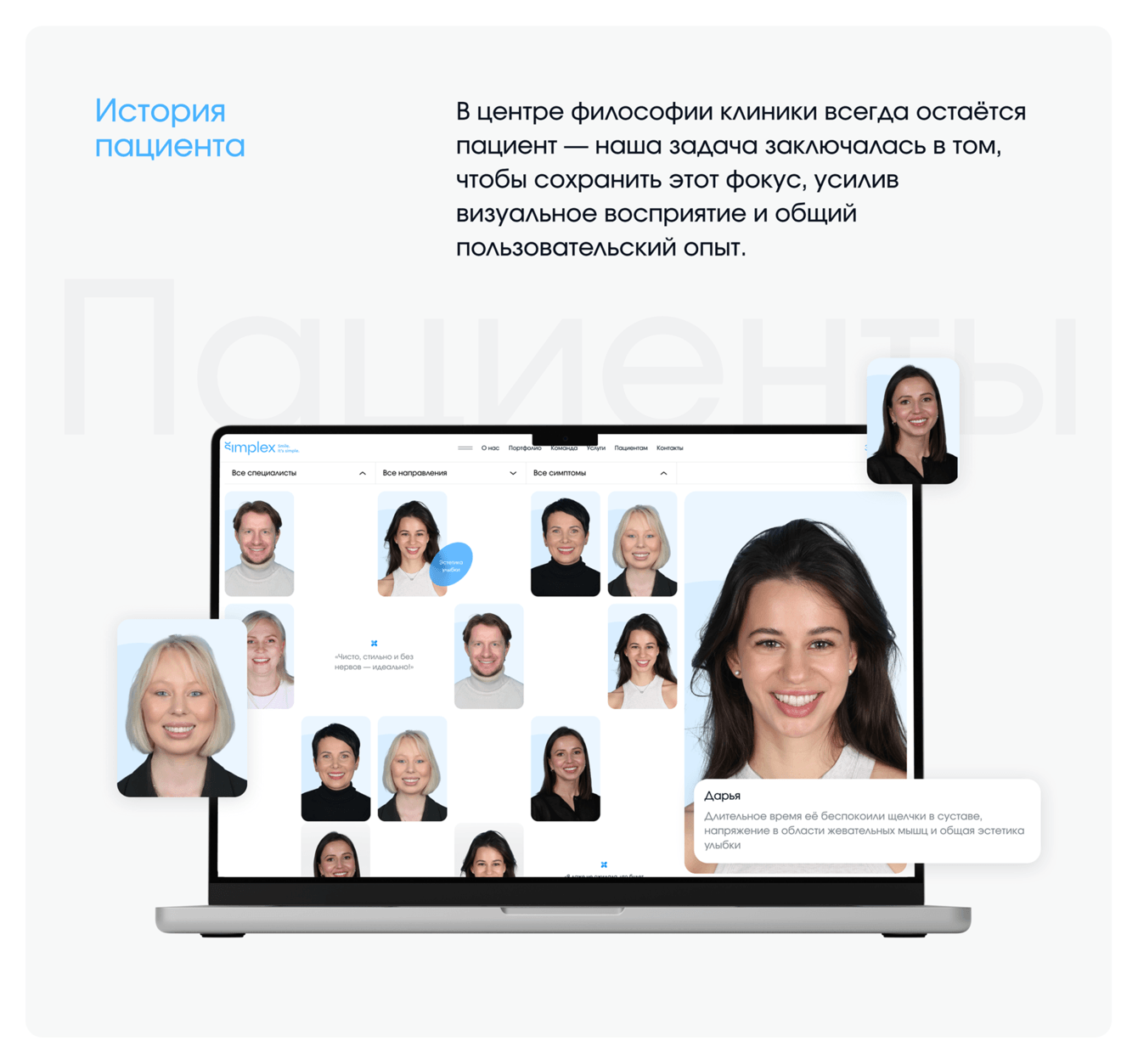 Идея сайта в том, что в центре внимания клиники всегда пациент. Собственно, на старом сайте это было также ключевой идеей и нам нужно было её сохранить, улучшив восприятие и визуальную часть.