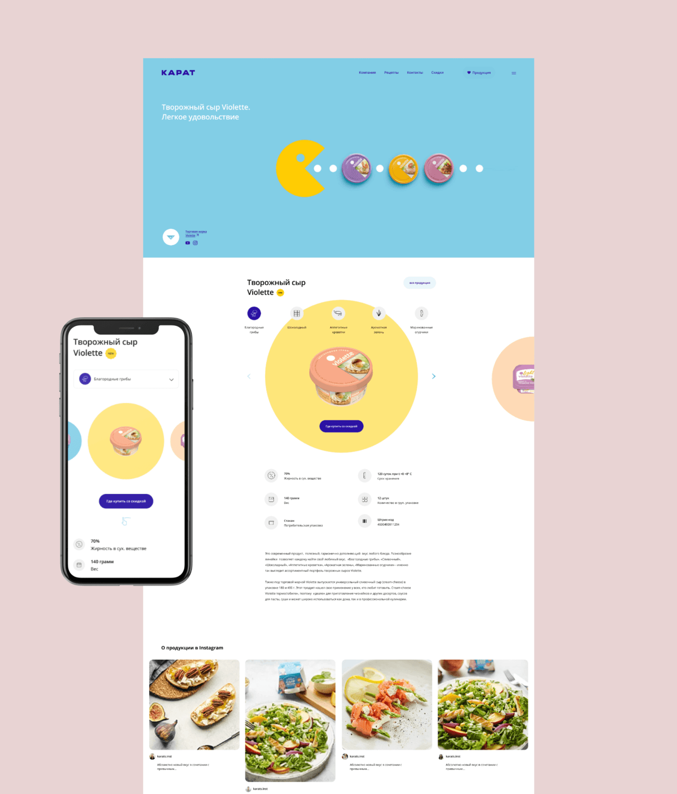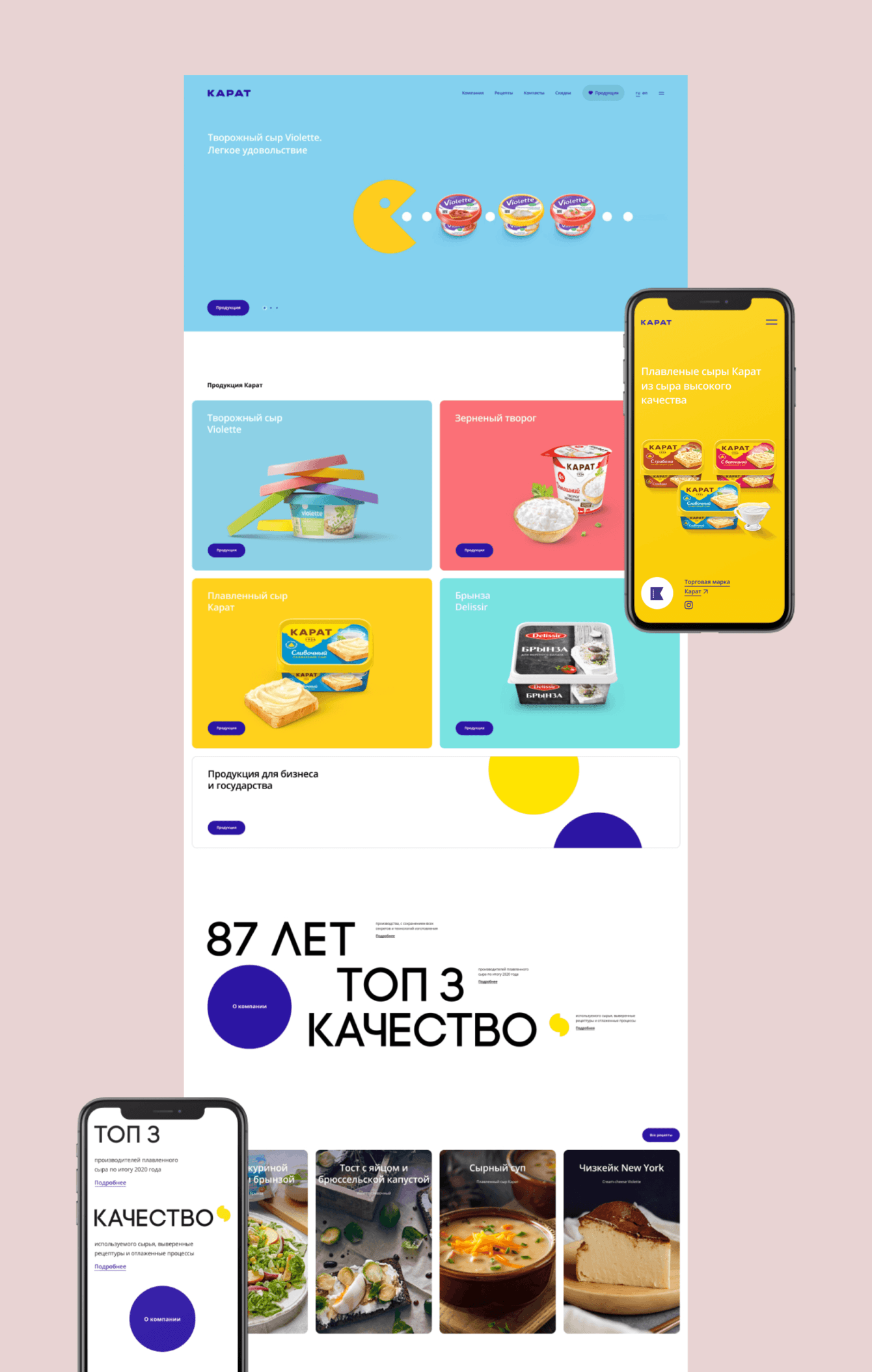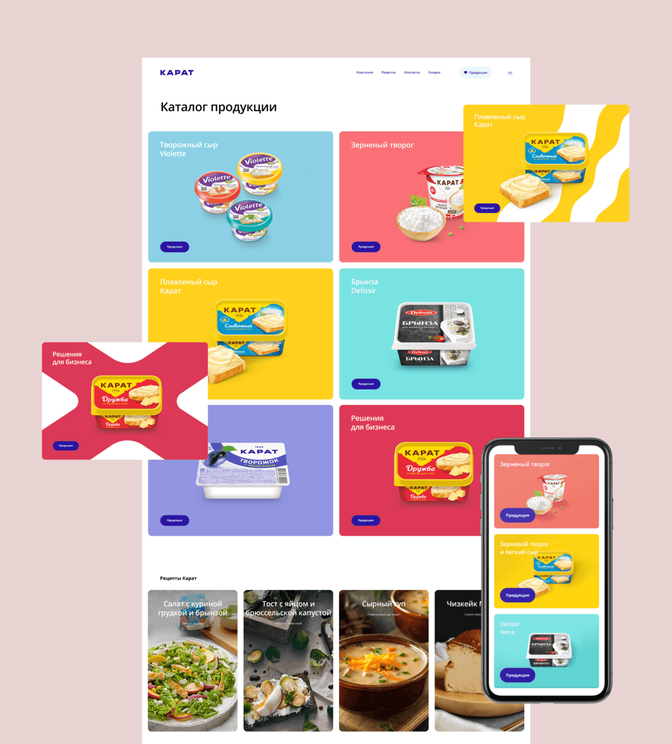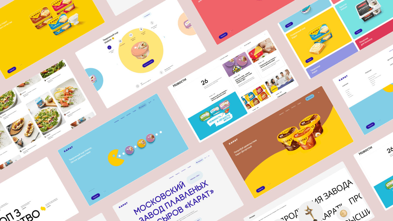 Полное обновление сайта для легендарного Московского завода плавленных сыров Карат. Ярко презентовать торговые марки и продукцию, погрузить в историю и культуру завода.