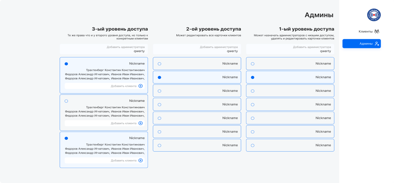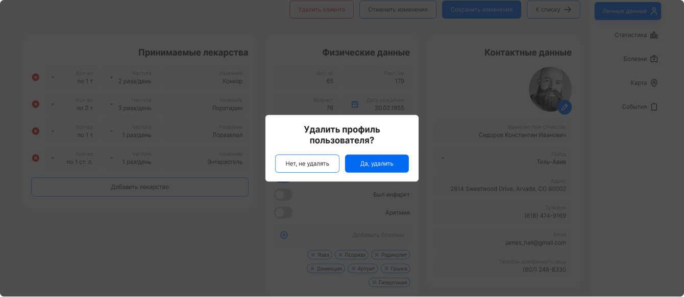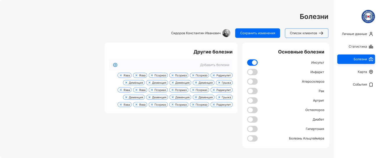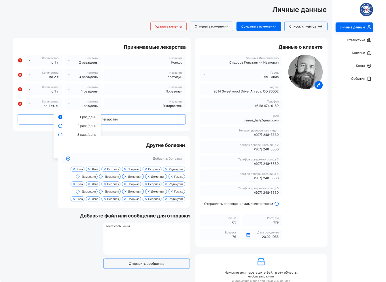 В структуре интерфейса наша команда сосредоточилась на информативности и простоте восприятия. Информация организована в логические блоки: "Личные данные", "Статистика", "Болезни", "Карта" и "События", что облегчает навигацию. Интуитивно понятные элементы управления, например, "Список клиентов" или "Удалить клиента", размещены в верхней части экрана для удобного доступа.