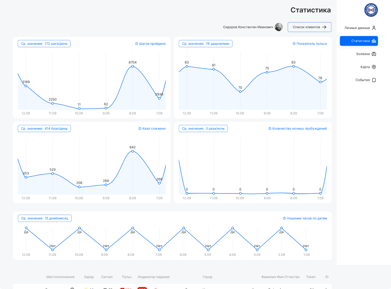 Раздел "Статистика" предоставляет данные о физических показателях, таких как количество шагов, пульс, сожженные калории и количество ночных пробуждений. Если жизненно важный показатель приблизится к критическому значению, менеджер немедленно получит уведомление для оказания экстренной помощи.