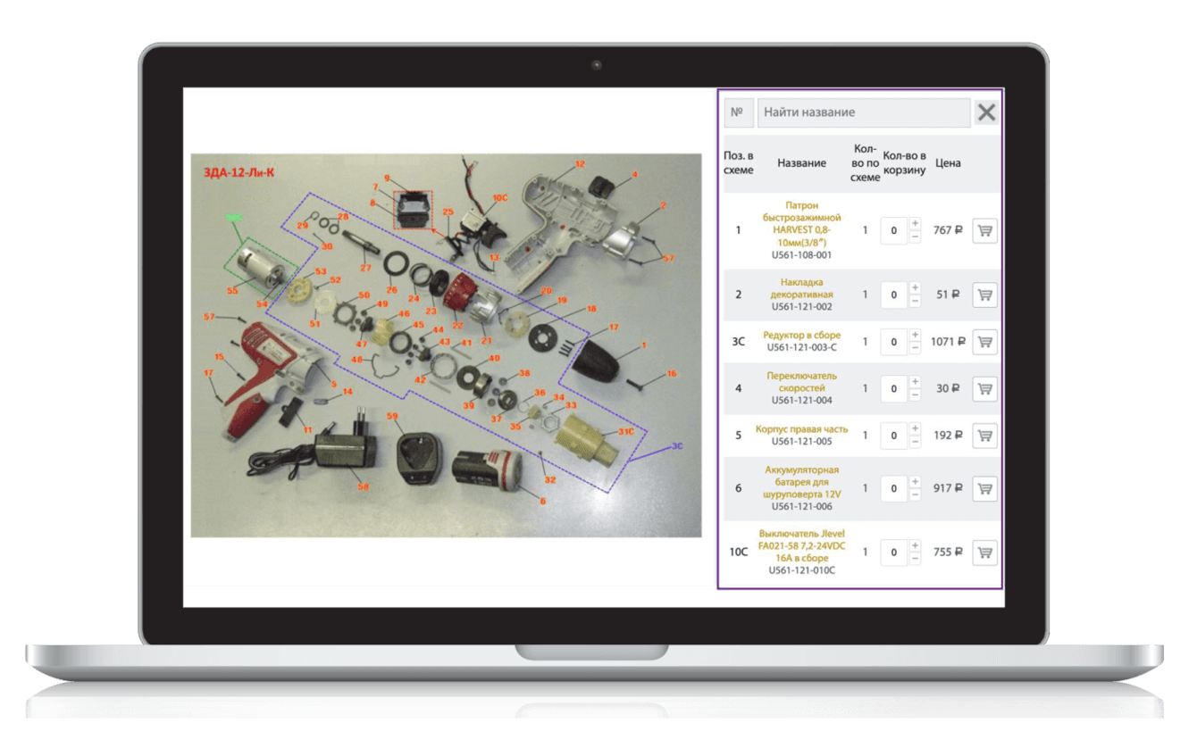 Каждый товар состоит из определенных частей, зайдя в карточку товара можно добавить в корзину как сам товар, так и отдельный его компонент в соответствии со схемой.