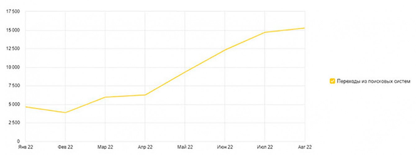 Вывод в ТОП-10 через 6 месяцев после начала работ, возвращение позиций в поиске, прирост целевых заявок.