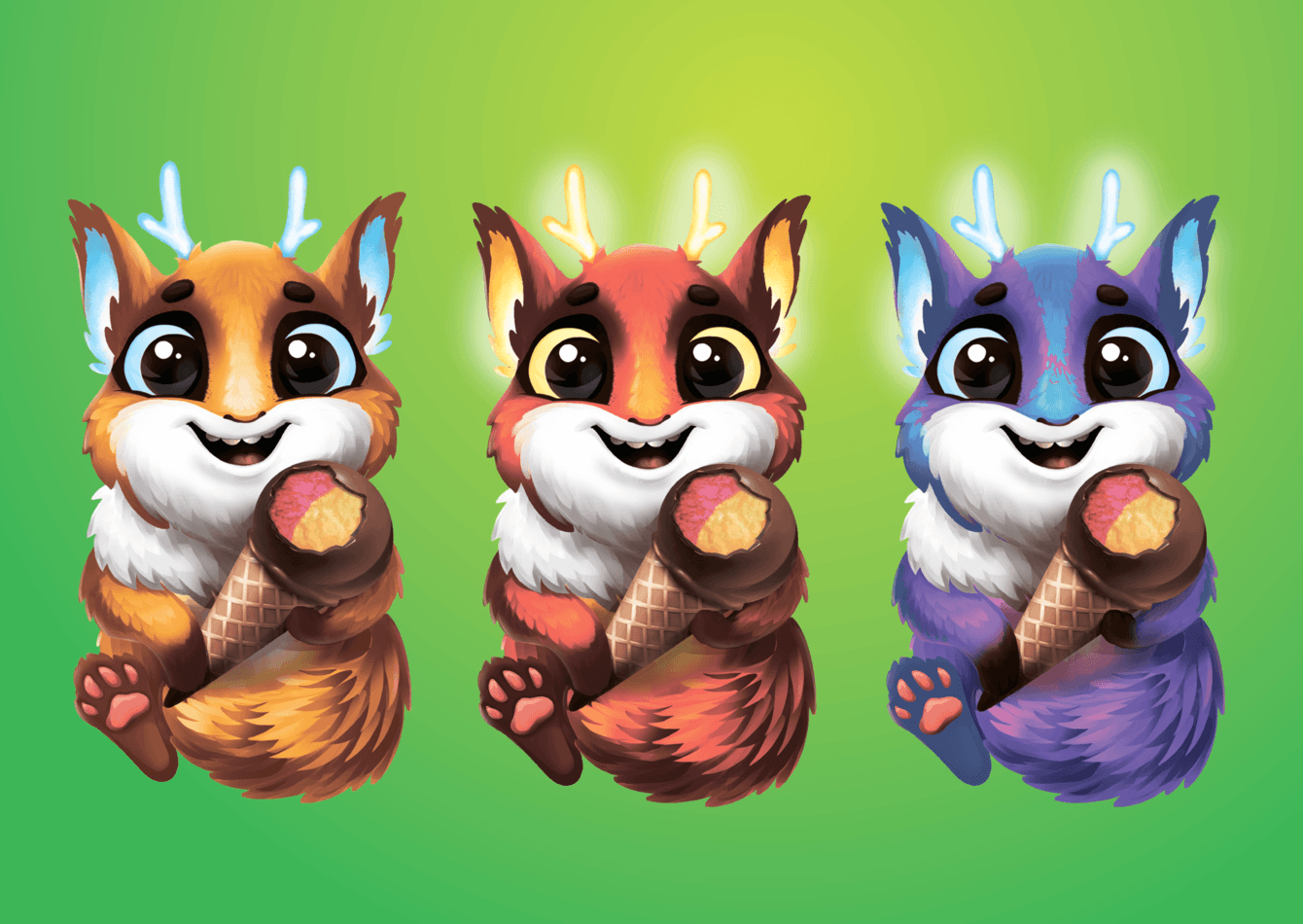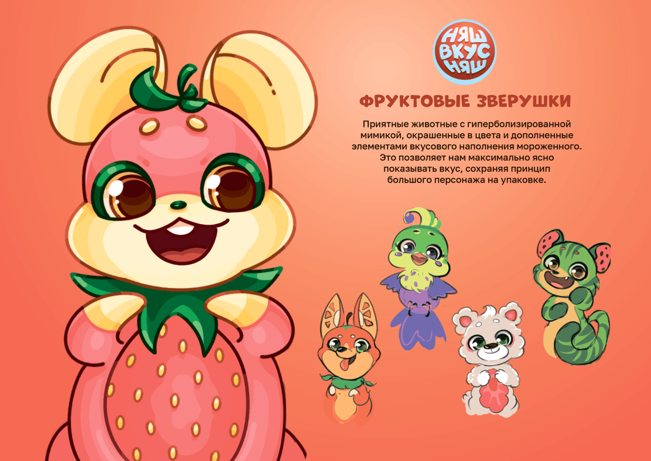 Далее, совместно с клиентом, был определен вектор иллюстрации и стилистики рисовки, а также утвержден логотип. На основе принятого решения мы отрисовали различных выдуманных зверушек, которые и легли в основу упаковки мороженого.