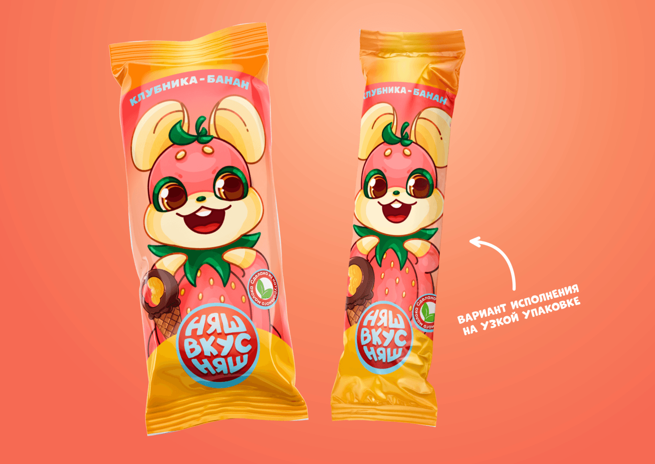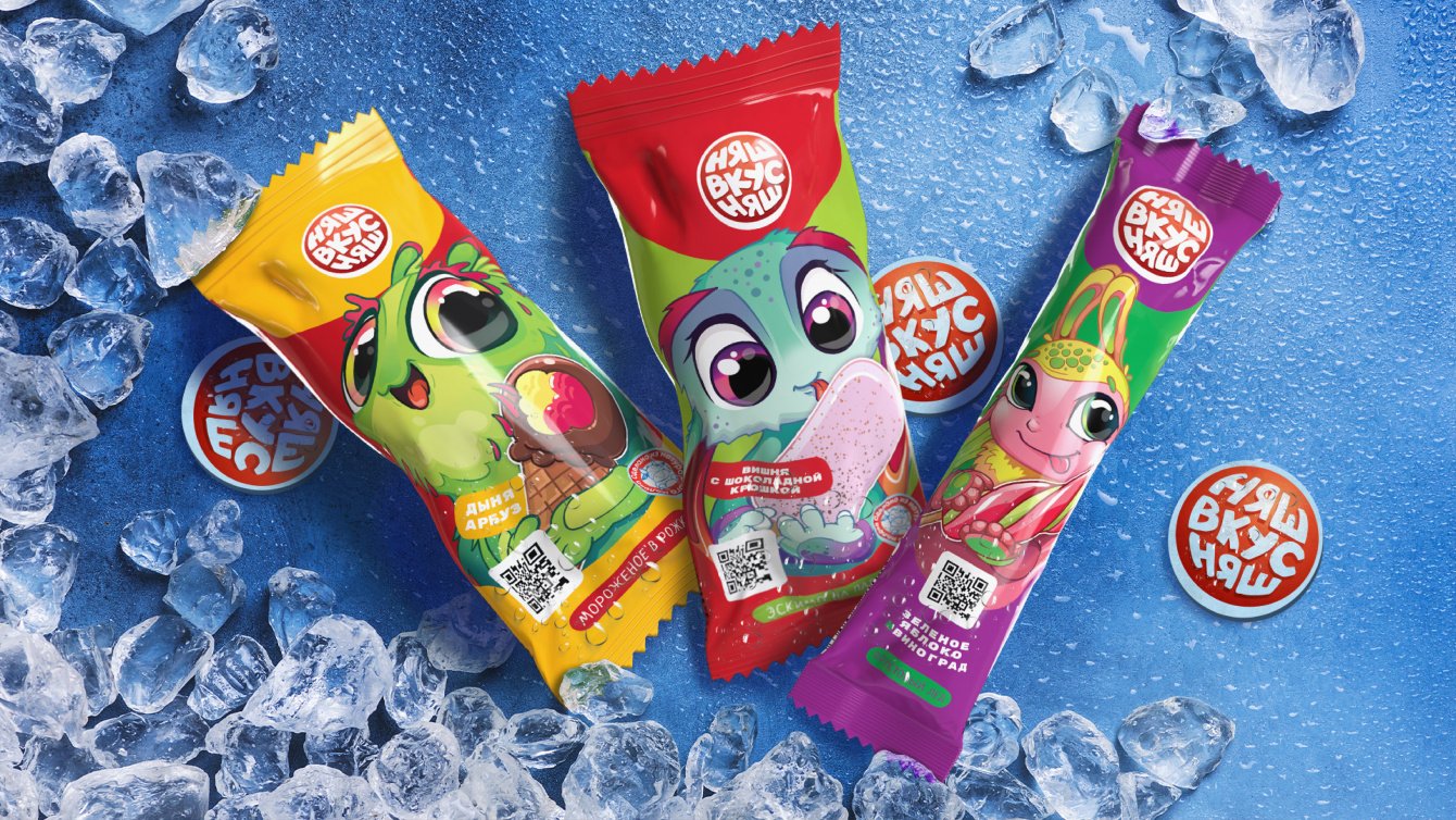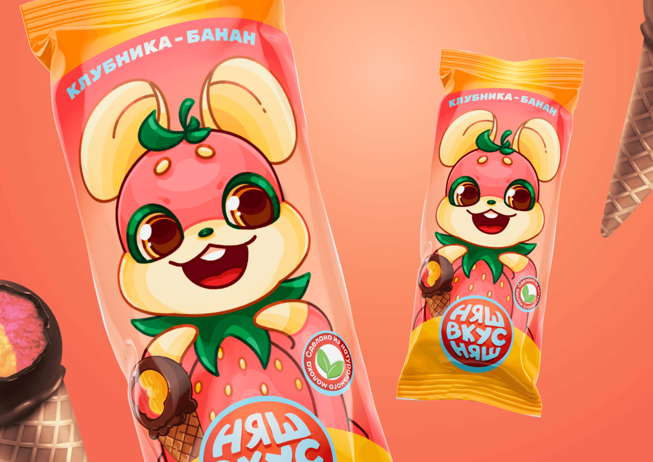 Новая серия мороженого «Няш Вкусняш» выделяется ярким и красочным дизайном упаковки, что делает продукт заметнее на прилавке, в сравнении с другими товарами данной категории.