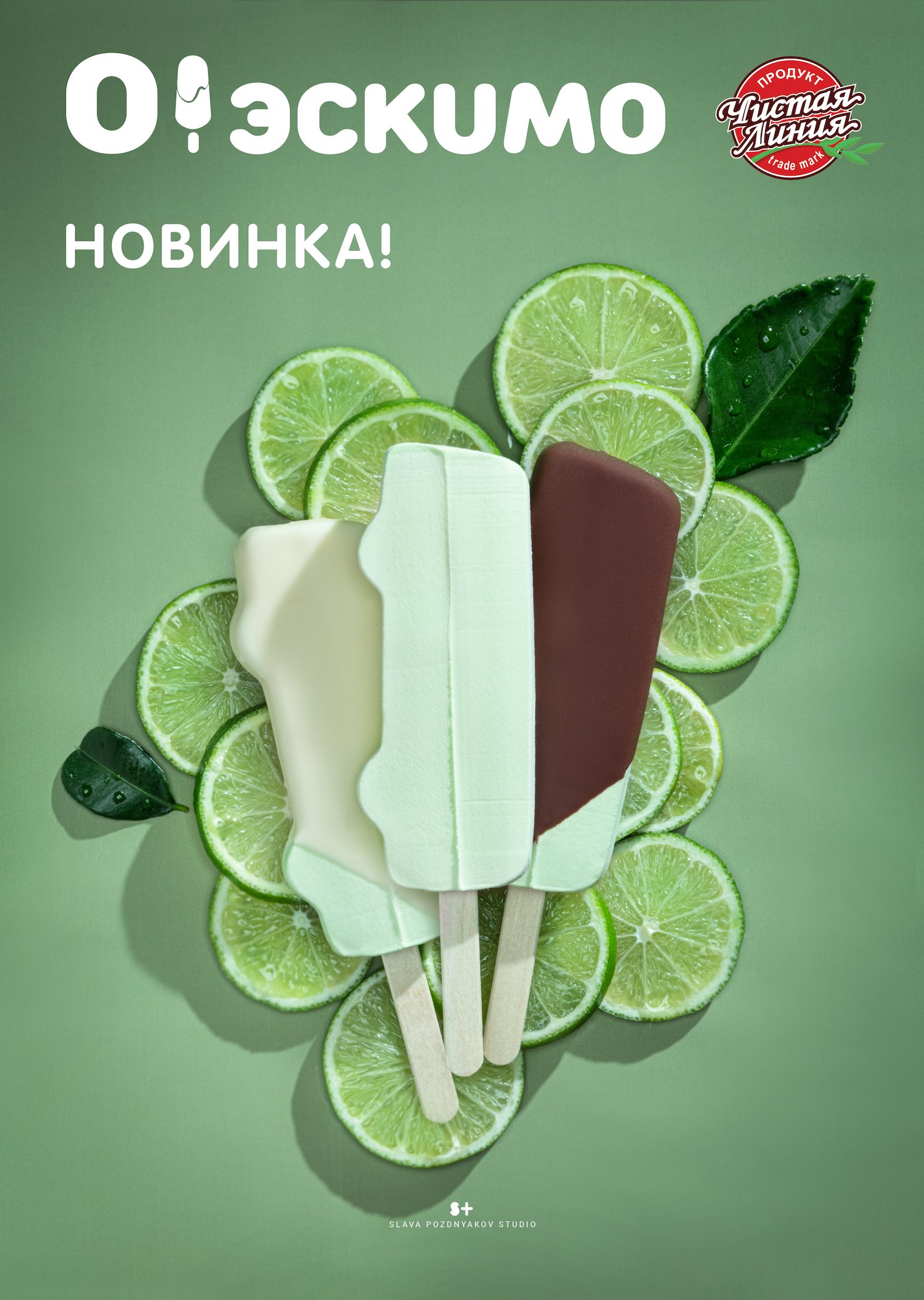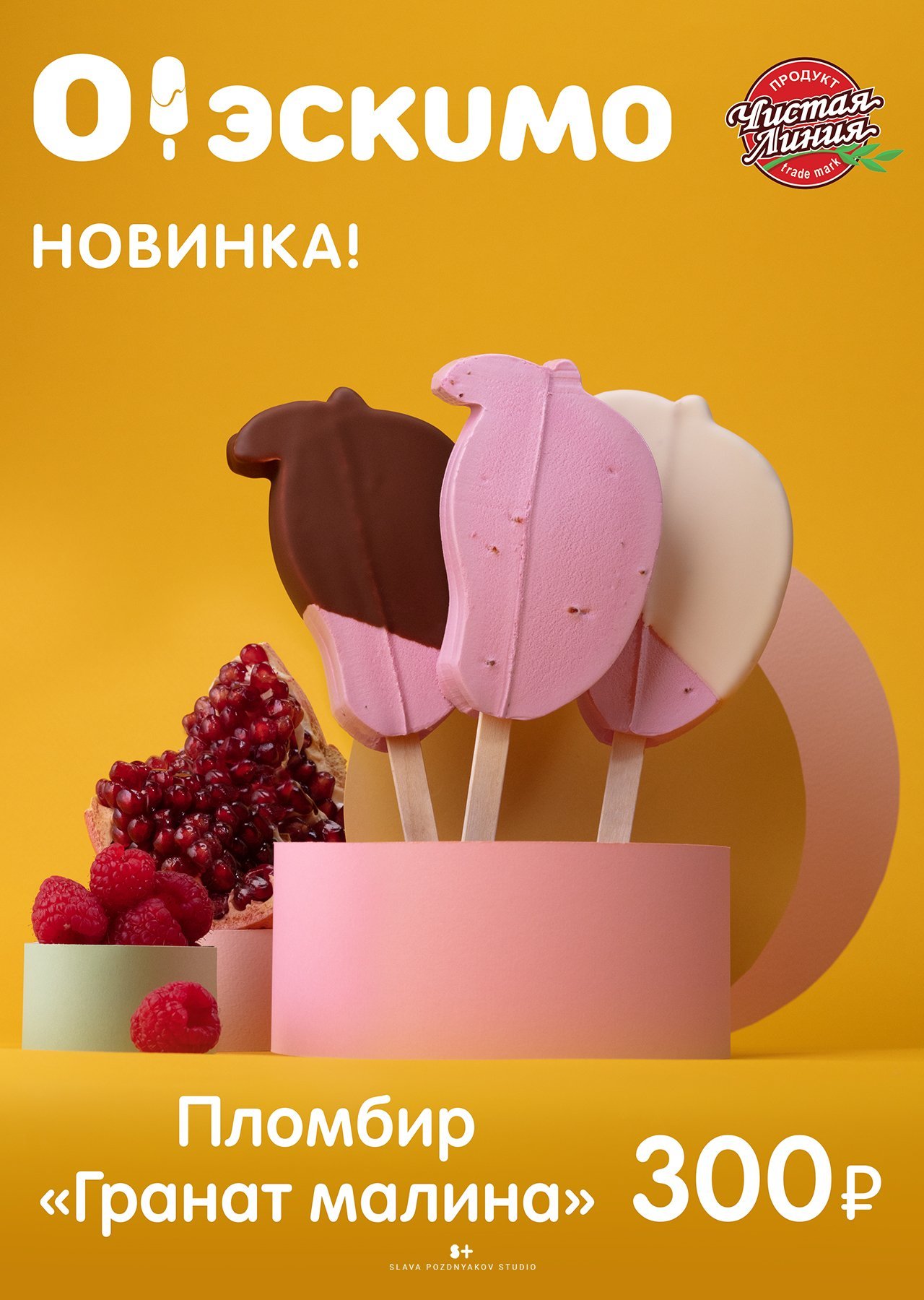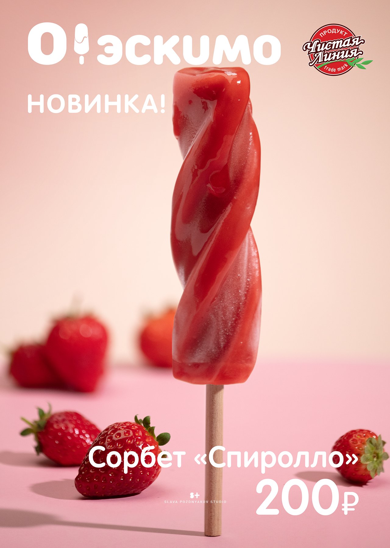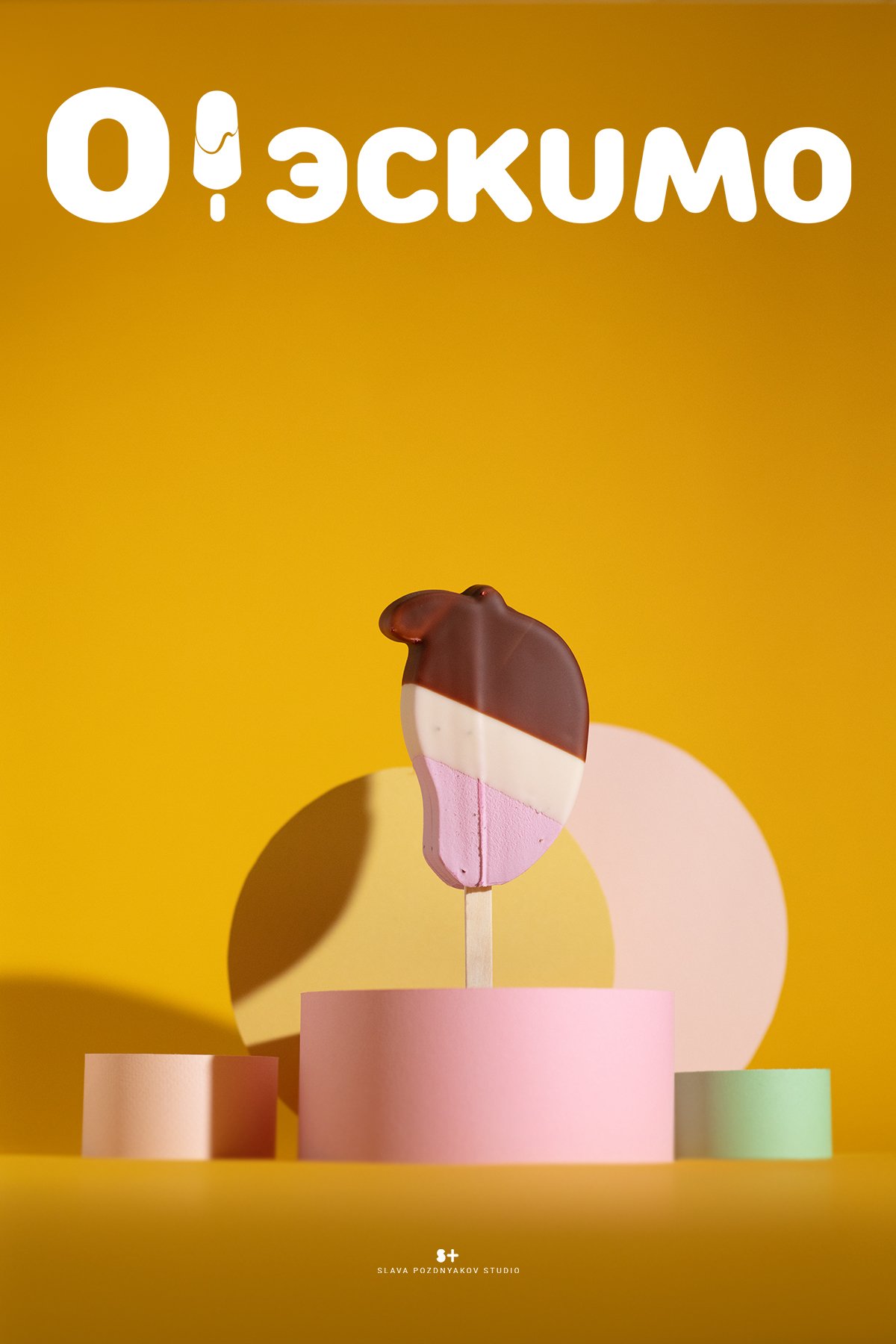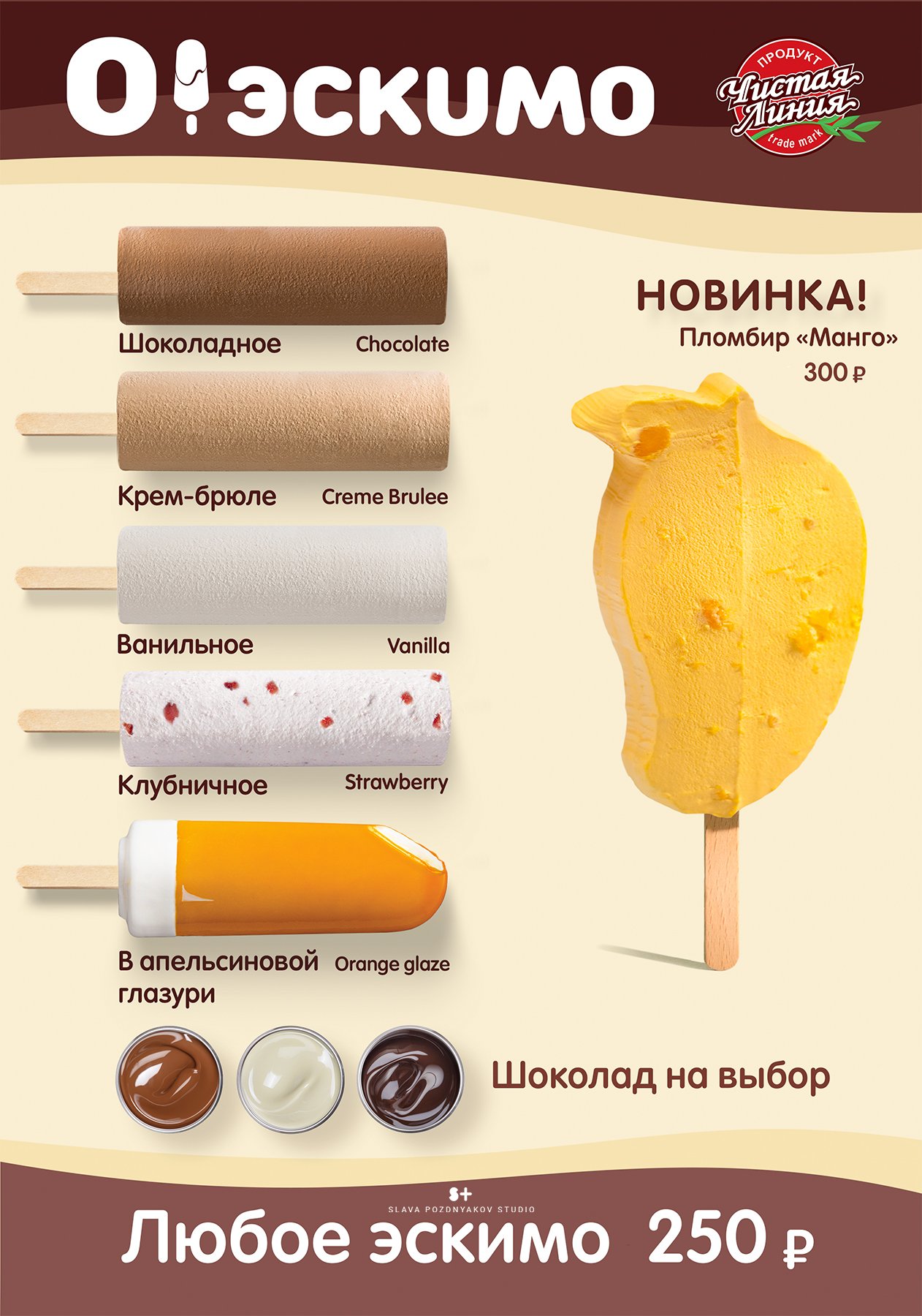 Для компании О!ЭСКИМО, которая представляет собой сеть точек витрин-конструкторов по производству мороженого, была проведена фотосъемка продукции для меню. В этих точках профессиональные мороженщики по вкусу покупателя окунают мороженое на палочке в натуральную шоколадную глазурь.