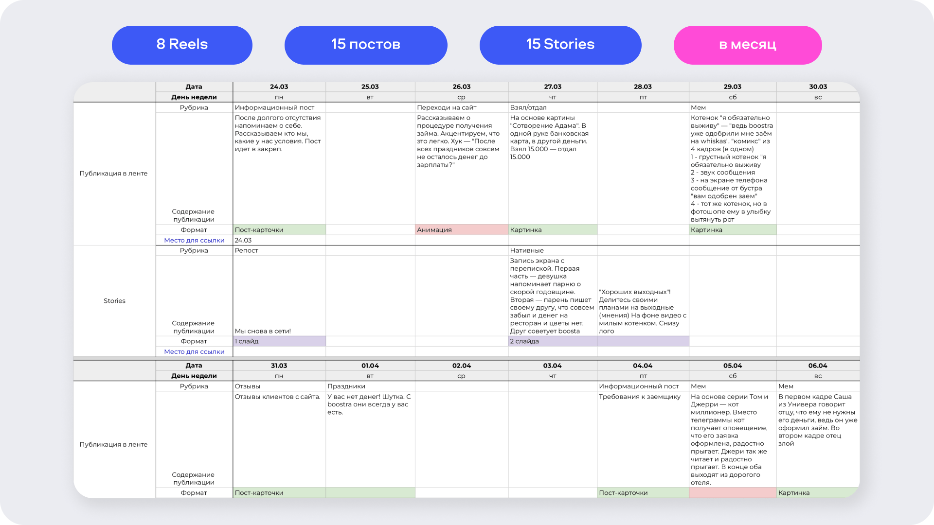 Продуктовые посты. Большая часть была о том, как работает сервис, как оформить заявку и как происходит оформление. Такие посты вызывают доверие у аудитории и снижают скептицизм, конкретно к платформе.