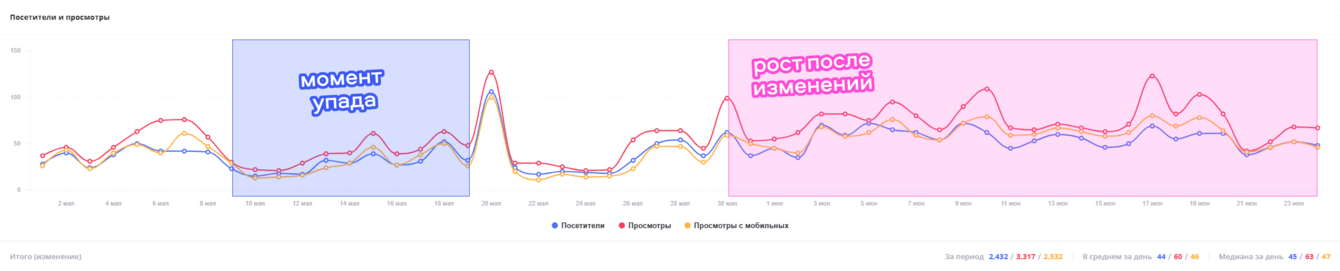 В результате после проседания активности и охватов выросли в 2 раза по просмотрам и визитам.