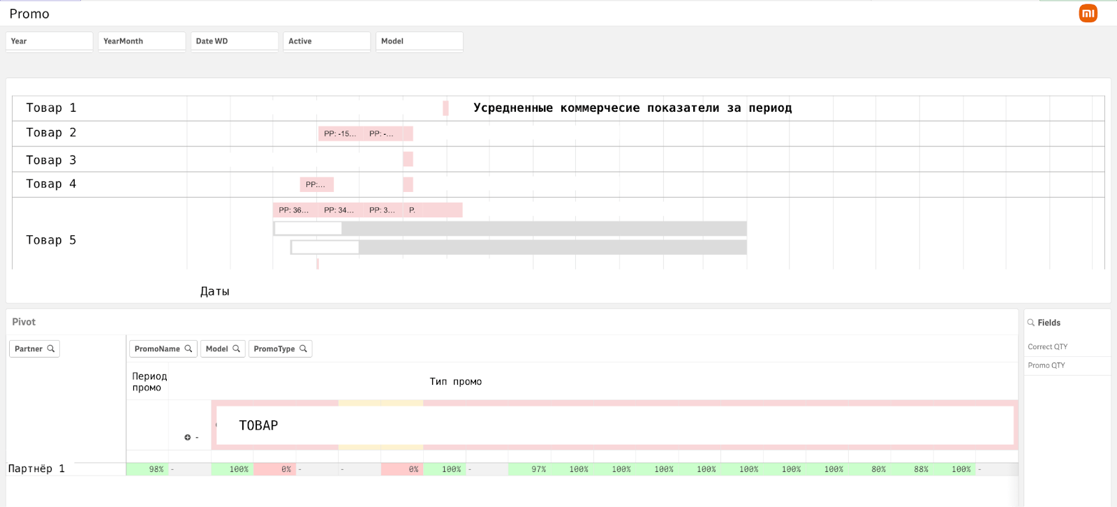 Один из важных инструментов для продаж — управление условиями акций (промо). В системе задается перечень моделей, дата начала и окончания промо, параметры: например, скидка, рост оборота, компенсация партнеру. Все цифры загружаются в BI, можно выбрать магазины, которые участвуют, таким образом компания видит, кто запустил промо, фактический процент роста и т. д.