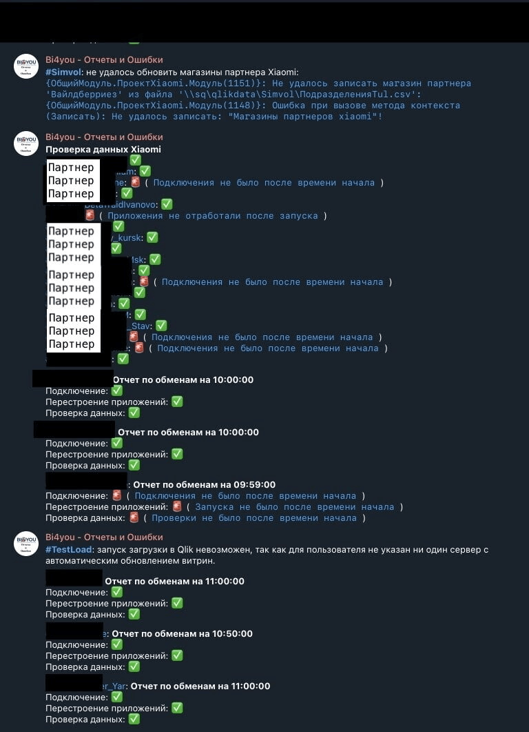 Кроме того, робот мониторинга проверяет все данные от партнеров и отправляет информацию в телеграм-группу. В системе есть расписание, когда информация должна приходить.