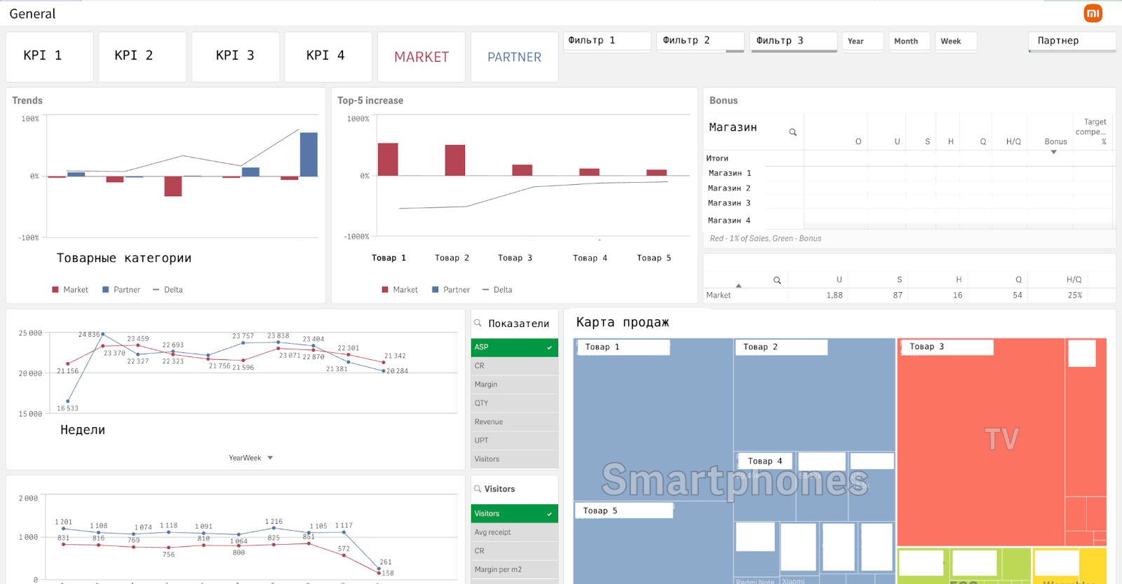 Клиентам мы установили коннектор и для каждого настроили отдельный визуал. Теперь партнер Xiaomi видит выручку, доход, план-факт анализ, остатки, видит, кто из регионов не выполняет план, динамики и тренды, как менялся клиентопоток, кросс-продажи, может проанализировать каждого продавца. Есть удобный инструмент собственного анализа отчетов.