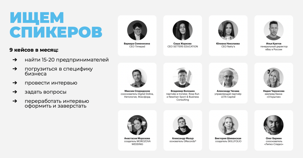 Но, конечно, непубличных основателей с интересной историей и готовностью делиться цифрами и внутрянкой бизнеса надо поискать. Для этого у нас внутри выстроена система работы с контентом канала: есть менеджеры, которые занимаются поиском спикеров; продюсеры контента, которые погружаются в бизнес, готовят вопросы и проводят интервью; есть авторы, которые делают из устного интервью емкий и понятный кейс, и дизайнеры, которые занимаются оформлением. В каждом кейсе — реальный опыт, факапы и успехи.