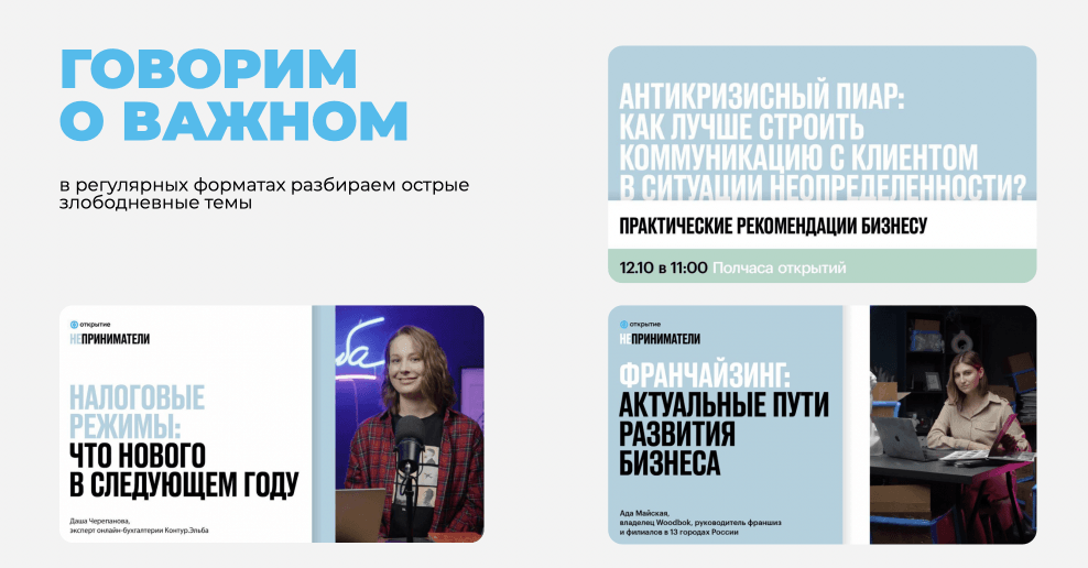 Когда мы стали полноценно заниматься контентом канала, мы адаптировали разговорный формат войс-марафона в регулярную рубрику «Полчаса Открытий». Это короткий «созвон» со спикером в телеграм-канале «Неприниматели», на котором мы каждую неделю обсуждаем актуальные проблемы для бизнеса в России. За 30 минут спикер раскрывает тему, и у слушателей остается время на вопросы.