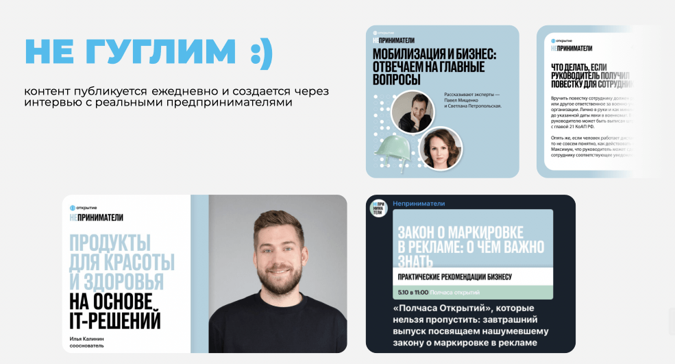 Вся работа в канале строится на взаимодействии с реальными предпринимателями. Кейс — это ключевой формат канала, для каждого мы ищем владельцев бизнесов из абсолютно разных ниш, при этом им не обязательно пользоваться продуктами банка, чтобы поделиться своей историей и опытом. Среди спикеров, которые принимали участие в контенте канала, много тех, кого хорошо знают в предпринимательском сообществе и настолько же много непубличных основателей, чей опыт нередко оказывается еще более интересным.