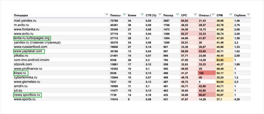 2) Отключение площадок с высокими отказами: добавление в запрещенные тех площадок, по которым происходит расход бюджета, но пользователи по каким-либо причинам сразу покидают сайт.