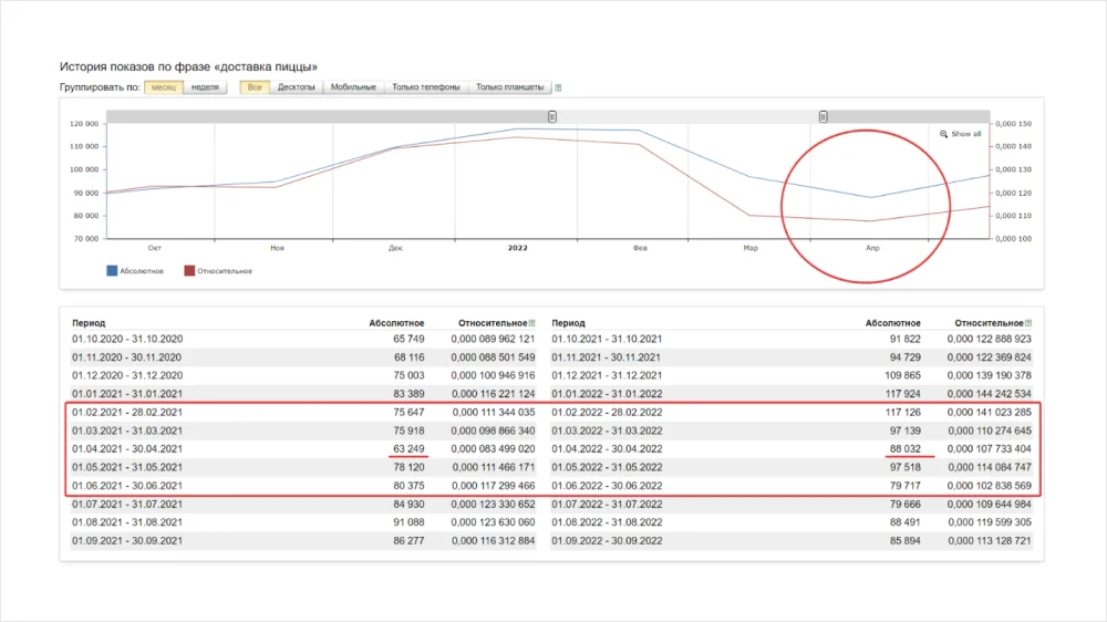 Скриншот: сезонность спроса на доставку по данным Вордстата.