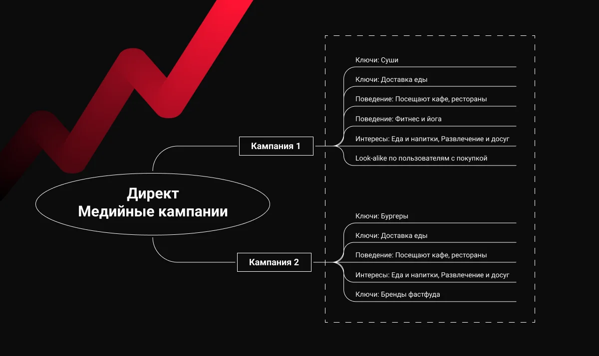 - Запустить performance-кампании на Поиске и в РСЯ для обеспечения полной загрузки заказами на доставку с сайта.