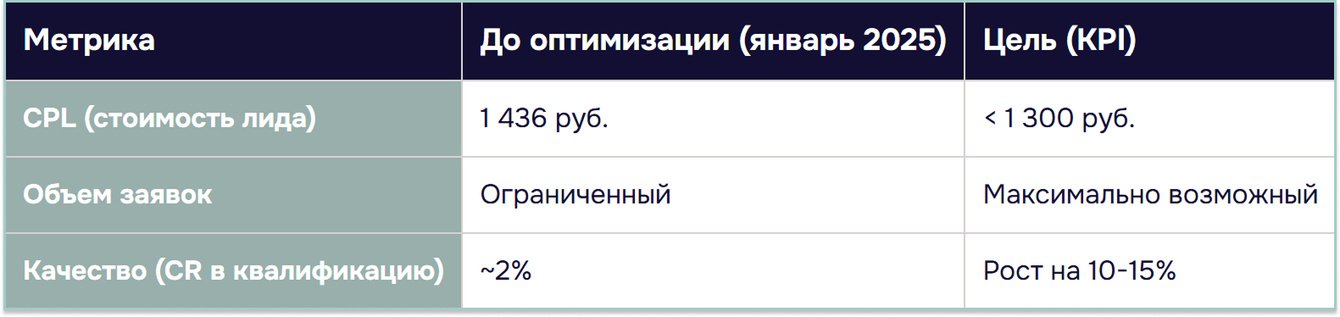 Задача: Снизить стоимость привлечения лида (CPL) до уровня ниже 1 300 рублей и обеспечить максимально возможный объем качественных заявок.