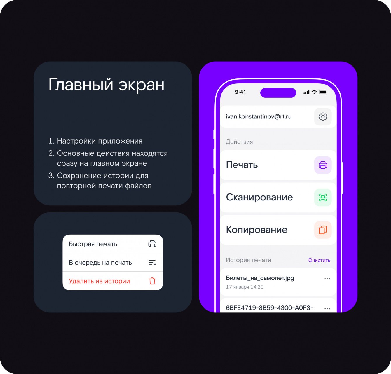 В приложении «Сервис Печати» сотрудники Ростелеком печатают, сканируют и копируют документы в офисах компании.