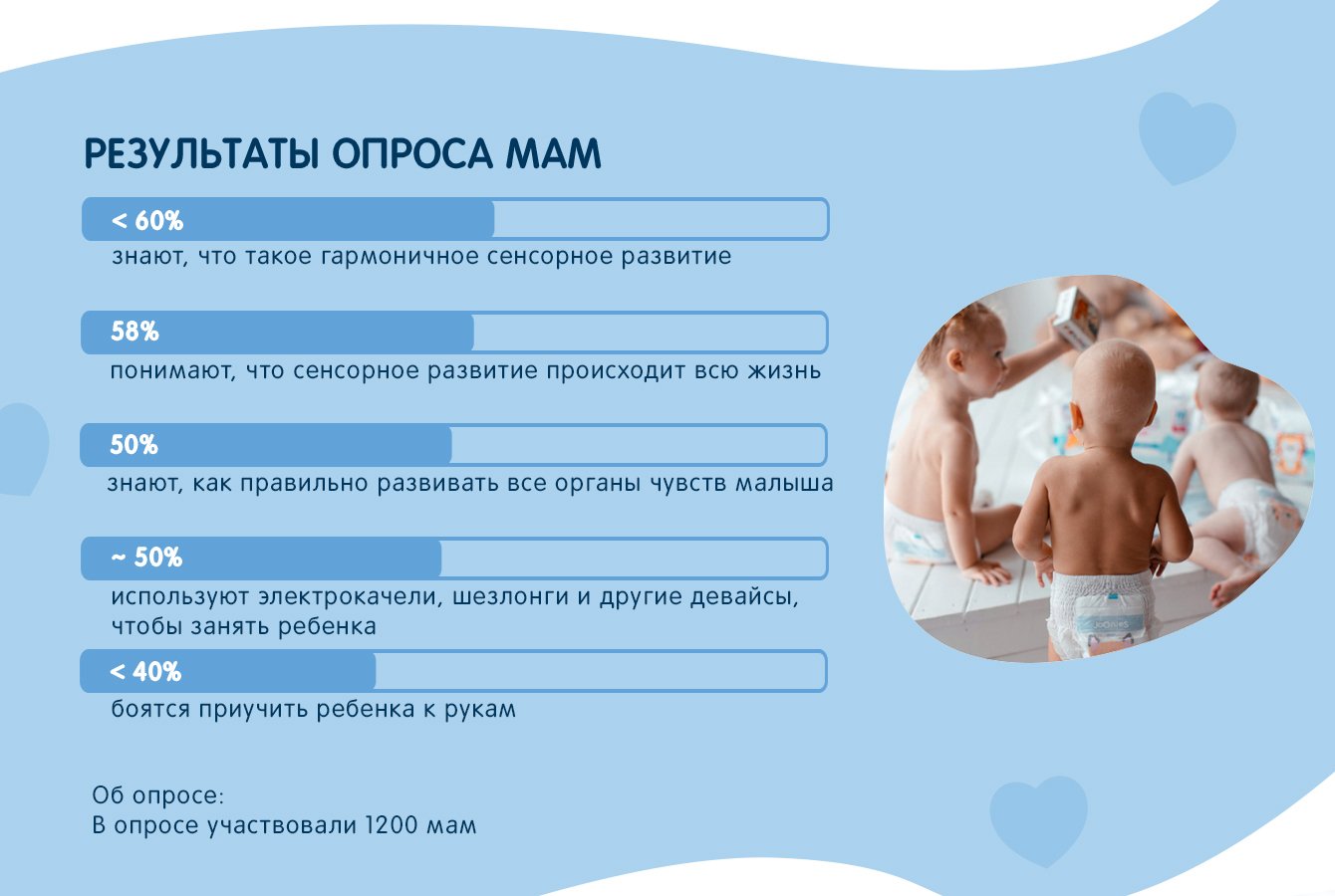 Результаты исследования подтвердили актуальность выбранной нами темы: в частности, мы выявили, что сегодня большинство российских мам детей до 3 лет в целом представляет, что такое гармоничное сенсорное развитие, однако половина из них не знает, как именно стимулировать его на каждом возрастном этапе.