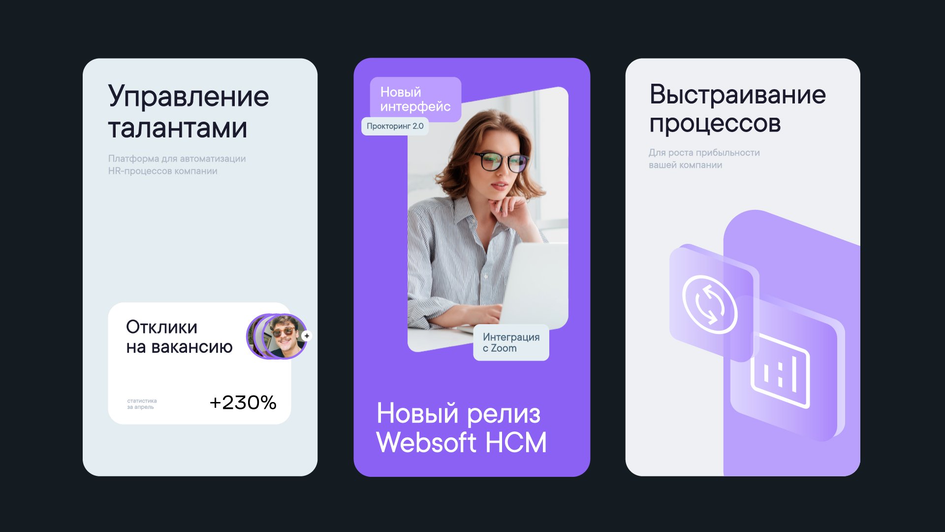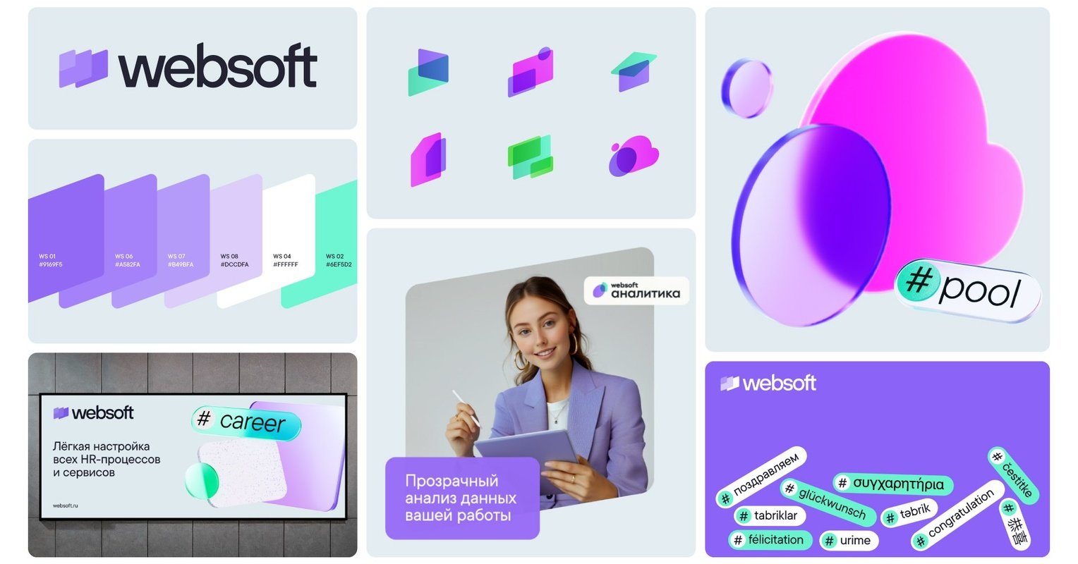 Websoft — ведущий российский разработчик HR-решений. Уже 25 лет компания помогает бизнесу управлять персоналом, а более 1000 внедрений платформы в разных отраслях подтверждают её экспертность и надежность. Со временем бренд изменился, став динамичнее и дружелюбнее, сохранив при этом свою серьезность и деловой настрой.