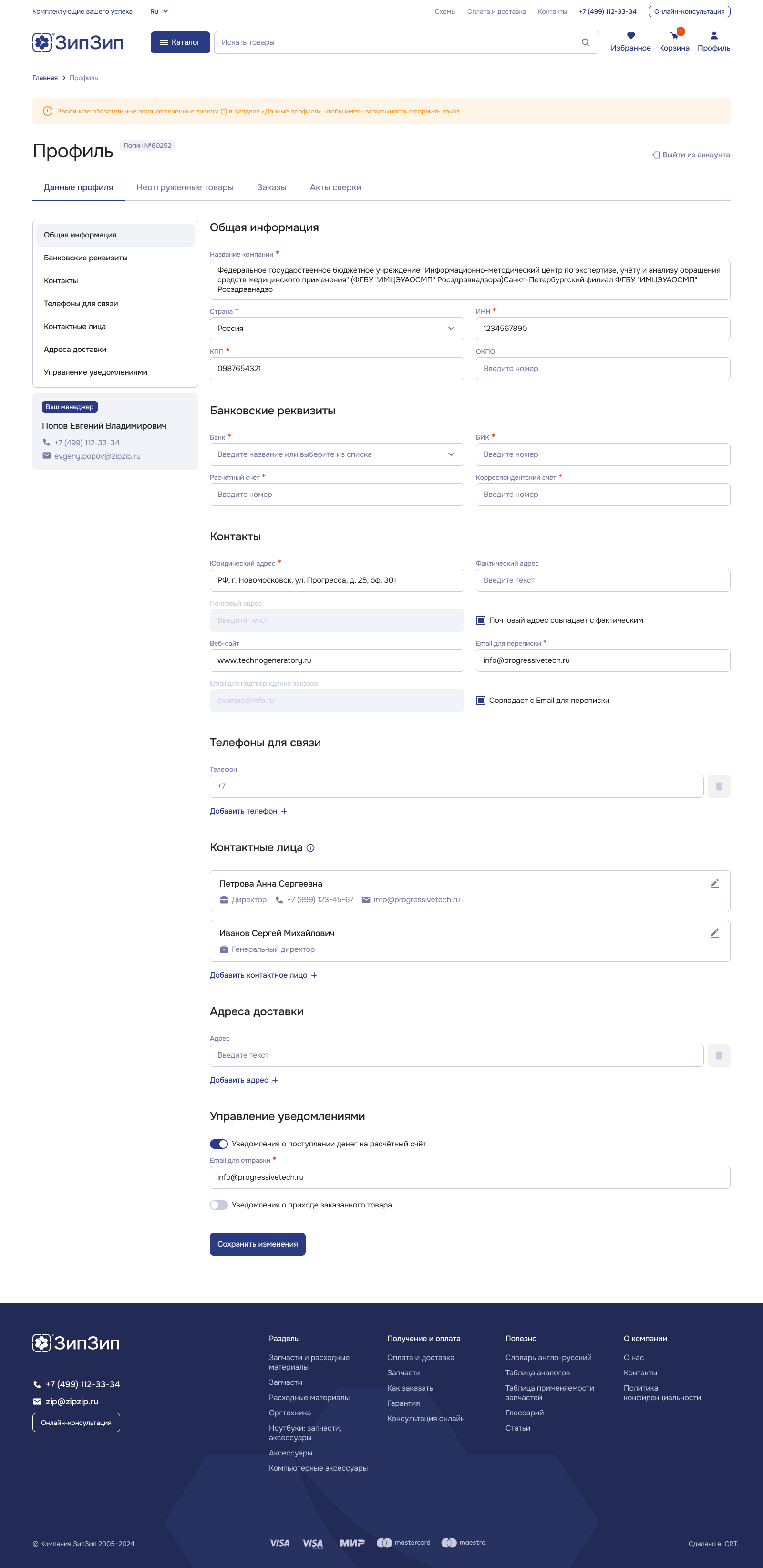 3) Гибкая корзина и оформление заказа: возможность покупки как для авторизованных пользователей, так и в гостевом режиме. Процесс оформления включает выбор транспортной компании, услуги страхования груза и адреса доставки.