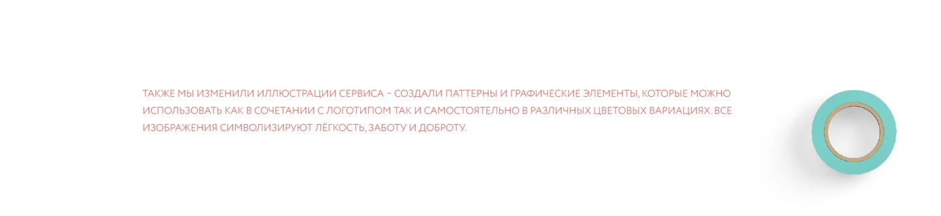 Обновили логотип и иллюстрации сервиса - создали паттерны и графические элементы, которые можно использовать как в сочетании с логотипом, так и самостоятельно в различных цветовых вариациях. Все иллюстрации символизируют лёгкость, заботу и доброту.