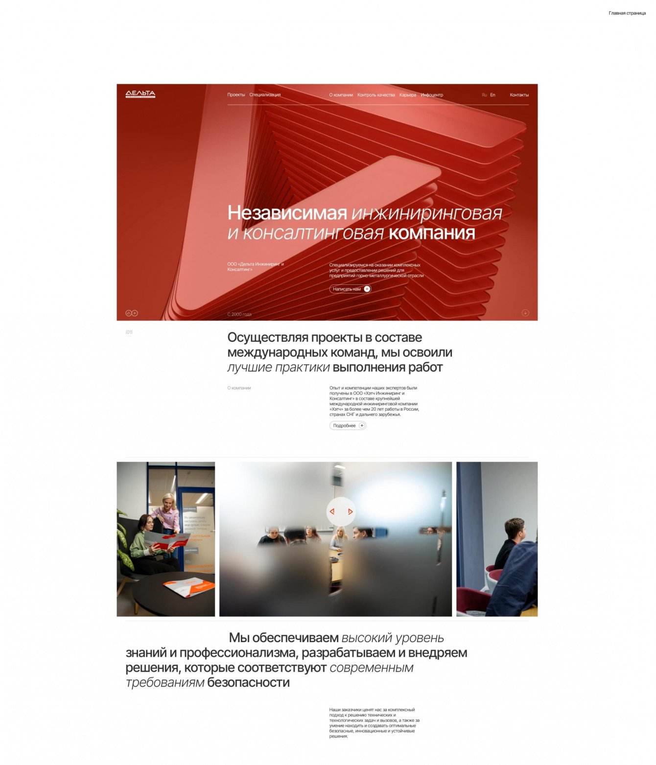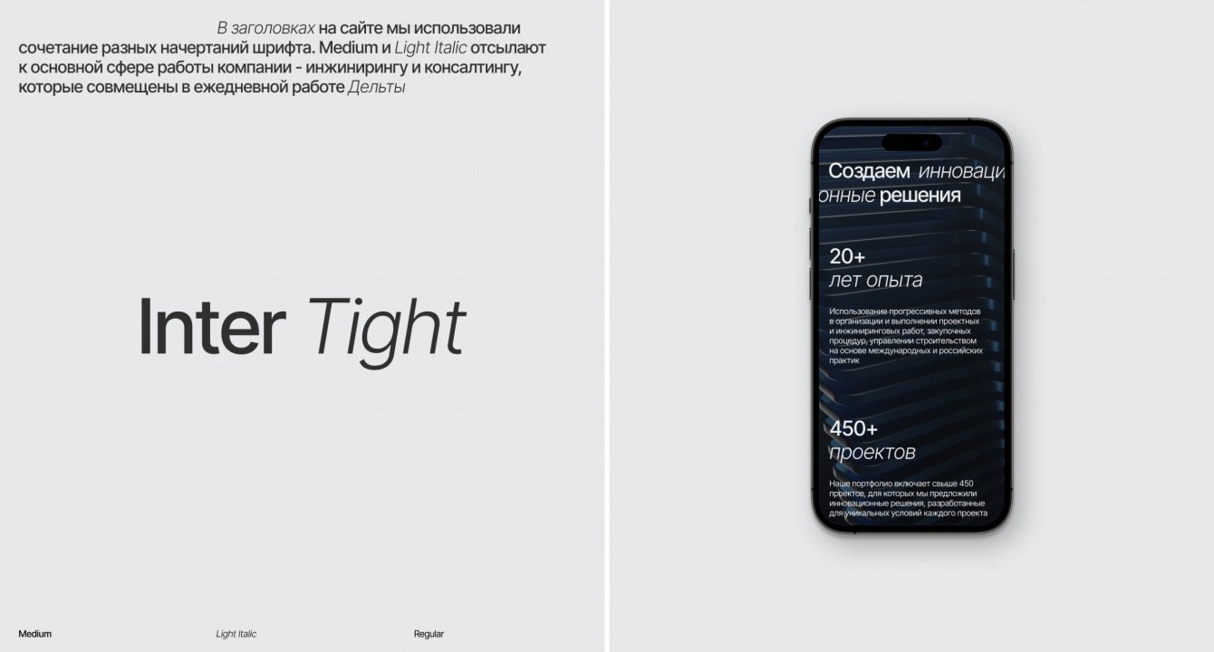 Так, в заголовках на сайте мы использовали сочетание разных начертаний шрифта. Medium и Light Italic отсылают к основной сфере работы компании - инжинирингу и консалтингу, которые совмещены в ежедневной работе Дельты и уже неотделимы друг от друга, оставаясь при этом абсолютно разными направлениями.