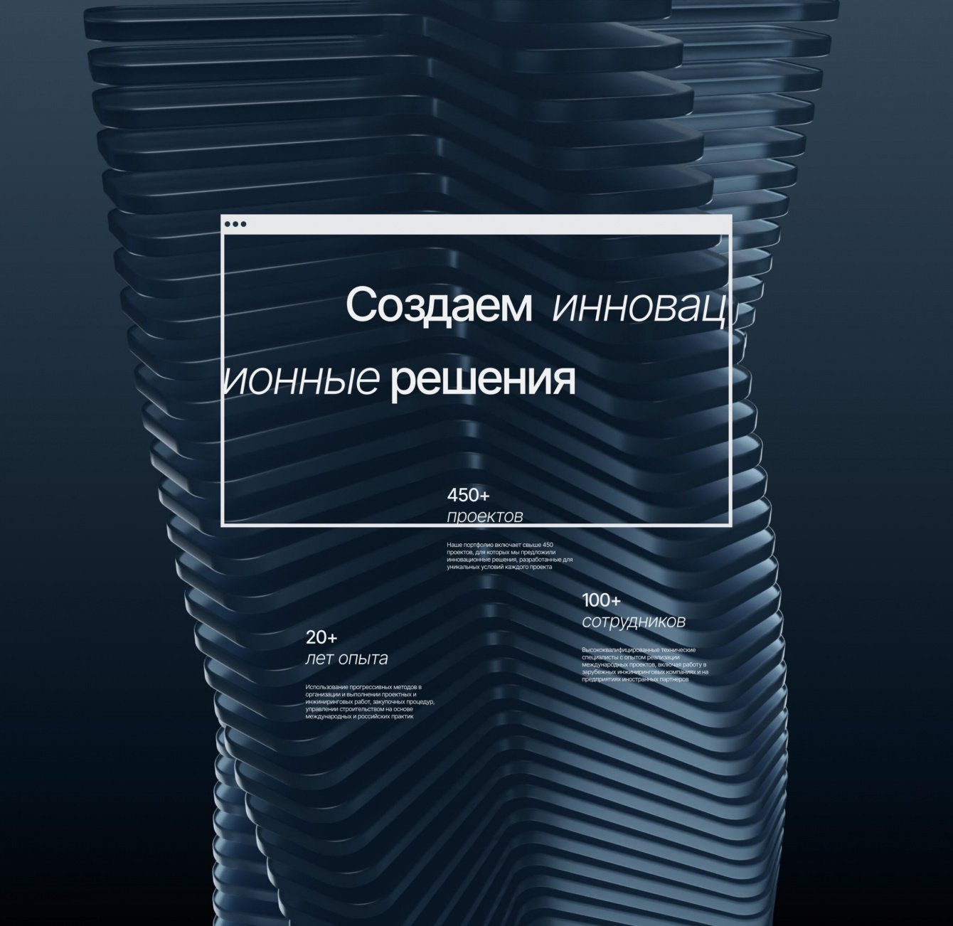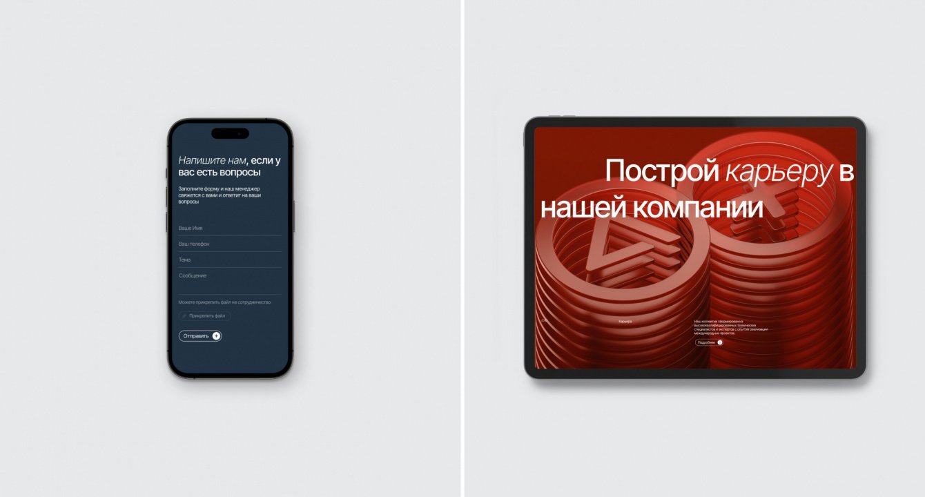 Чтобы сделать сайт как можно более уникальным, мы решили отказаться от использования стоковых материалов и разработали авторские 3D-модели и анимации из повторяющихся элементов со смещением. Эта форма - метафора на “лестницу”, по которой компания шаг за шагом поднималась, набирая опыт. Сами элементы выполнены в стиле стекла - это напрямую означает прозрачность работы компании и открытость в сотрудничестве.