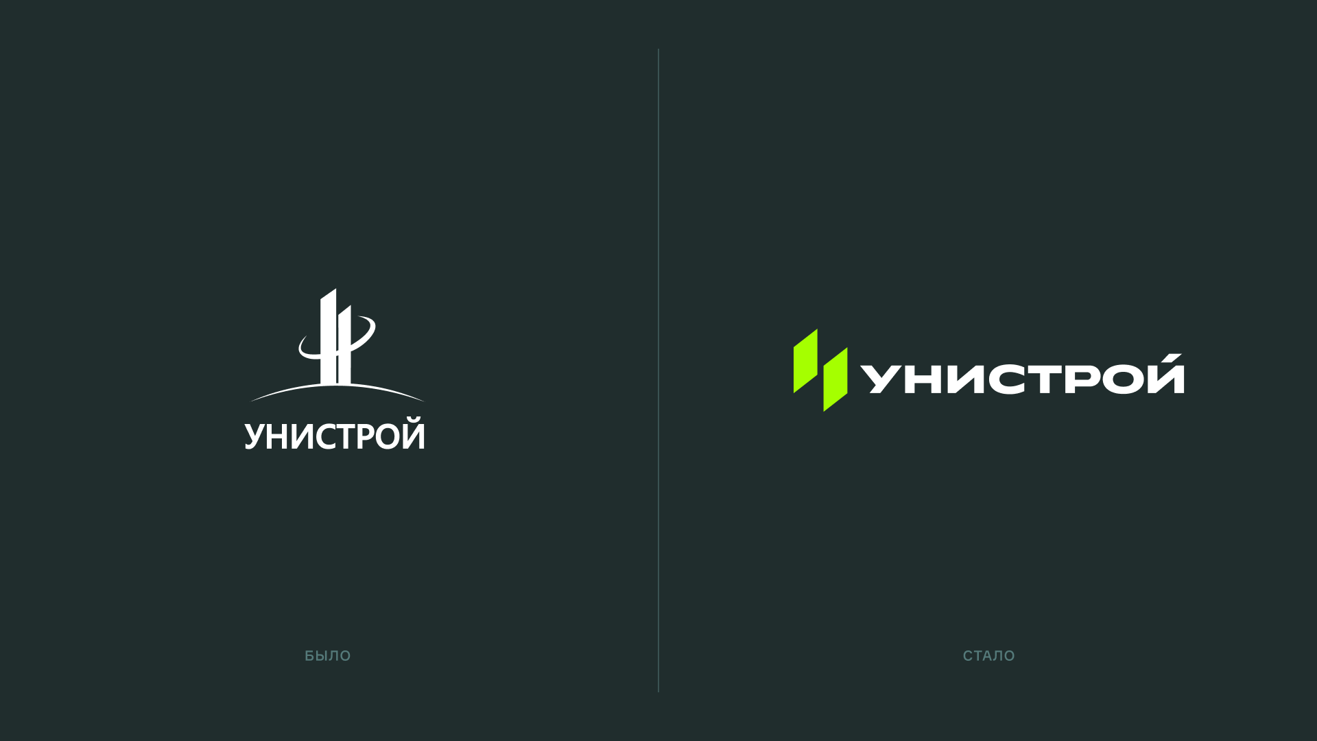 Предыдущий логотип компании выглядит как два таких скошенных небоскреба, стоящих на холме, и под ним надпись «Унистрой». Все обрамлено квадратом зеленого цвета.