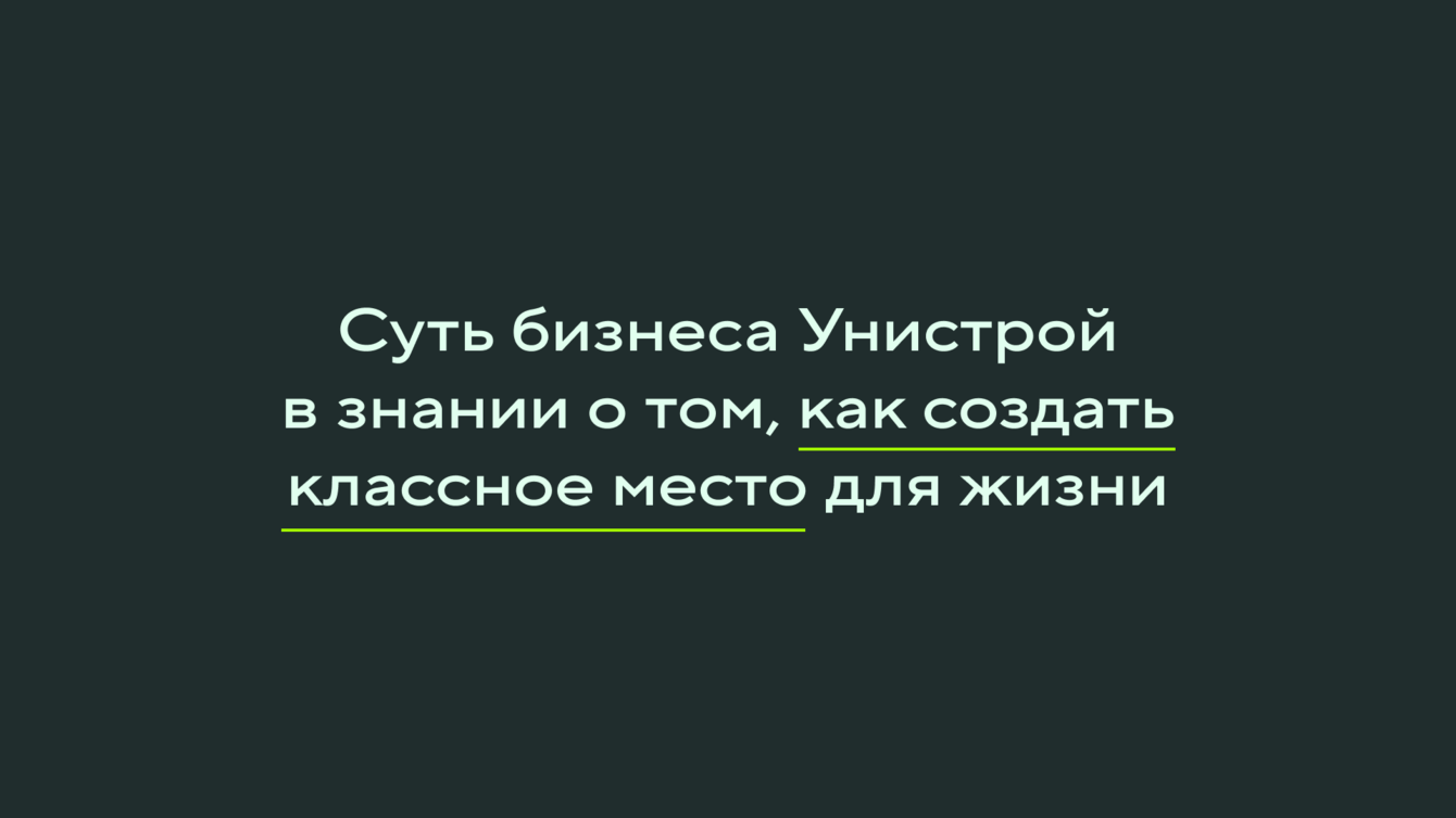 В бренде «Унистрой» мы решили сместить акценты и сделать фокус на том, что суть бизнеса заключена не только в строительстве, а в знании о том, как создать классное пространство для жизни.