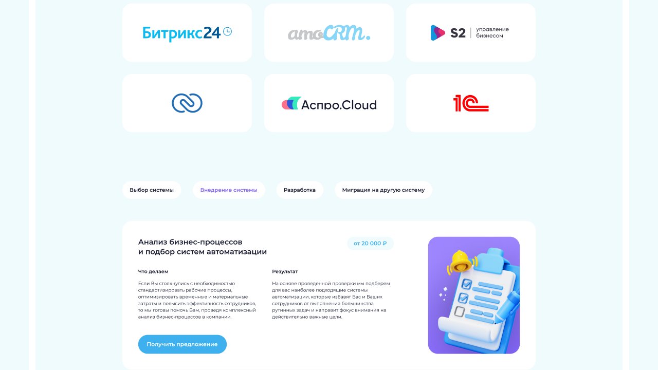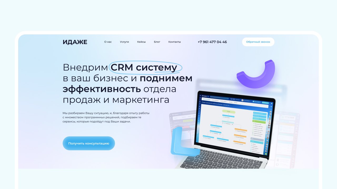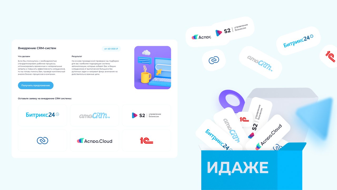 ИДАЖЕ – это компания, занимающаяся профессиональным внедрением CRM-систем и разработкой расширений для них уже более 10 лет. Прошлый сайт компании сильно устарел, был малоинформативен и плохо структурирован. Клиенты не могли найти нужную информацию, путались в разделах, и та информация о ценах и услугах, которая размещалась на сайте была уже неактуальна.