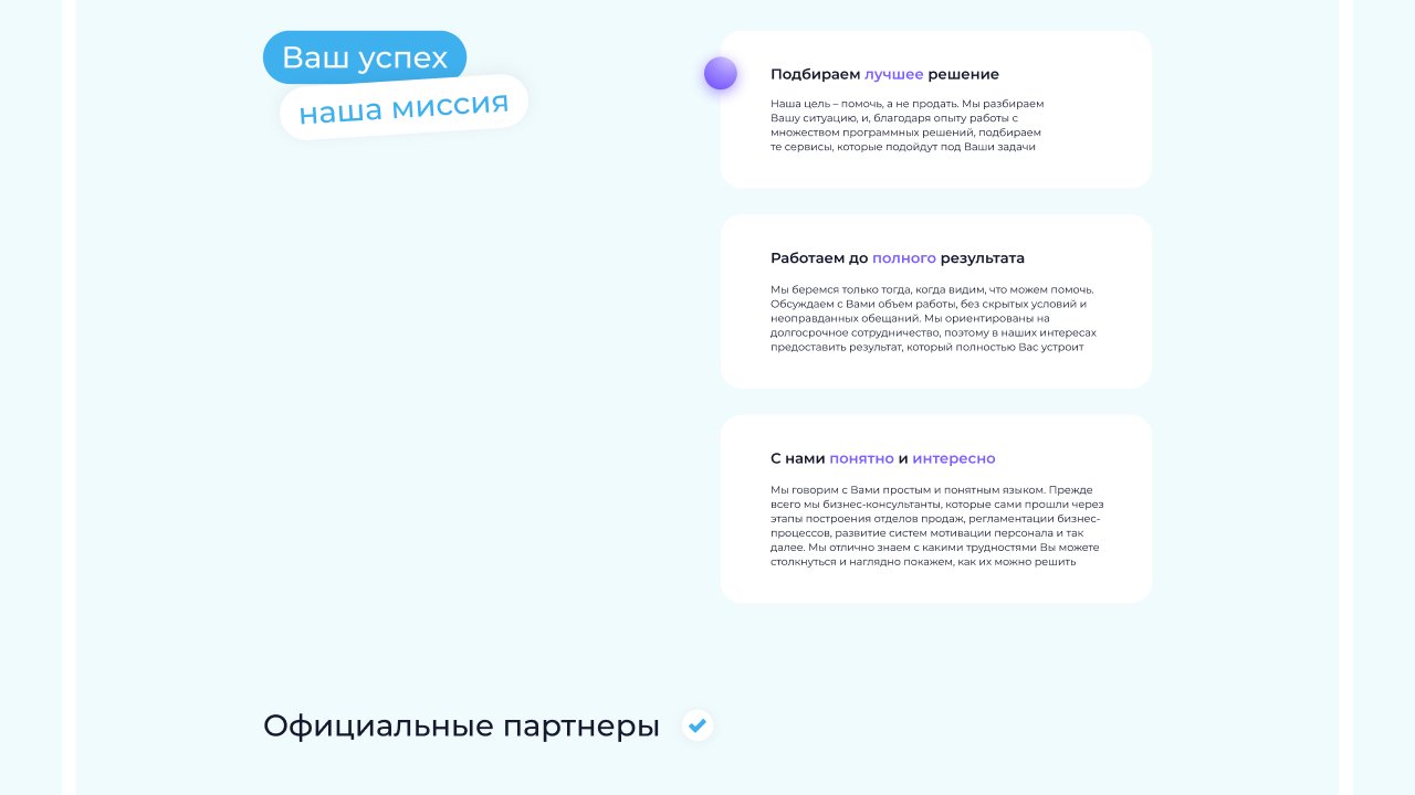 Идею открытости, дружелюбия и простоты в общении мы передали через минималистичный дизайн, наполненный яркими акцентами, объемными изображениями и легкой анимацией. Сайт выглядит современно и презентабельно, имеет мягкий приятный визуал и совсем не ассоциируется со строгостью и сложностью. Этого эффекта мы и добивались.