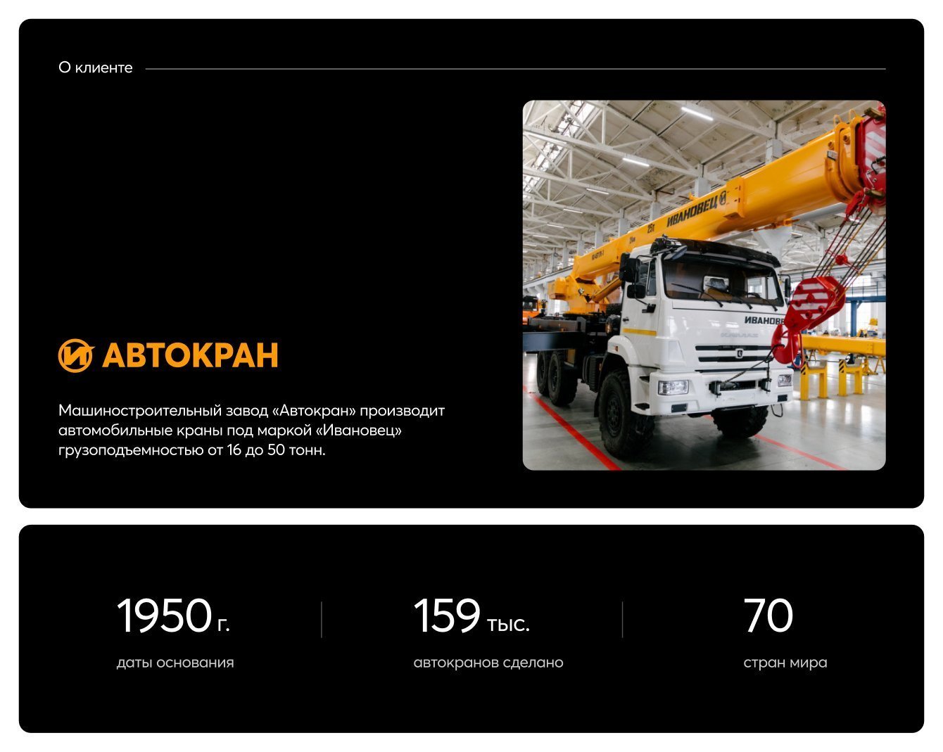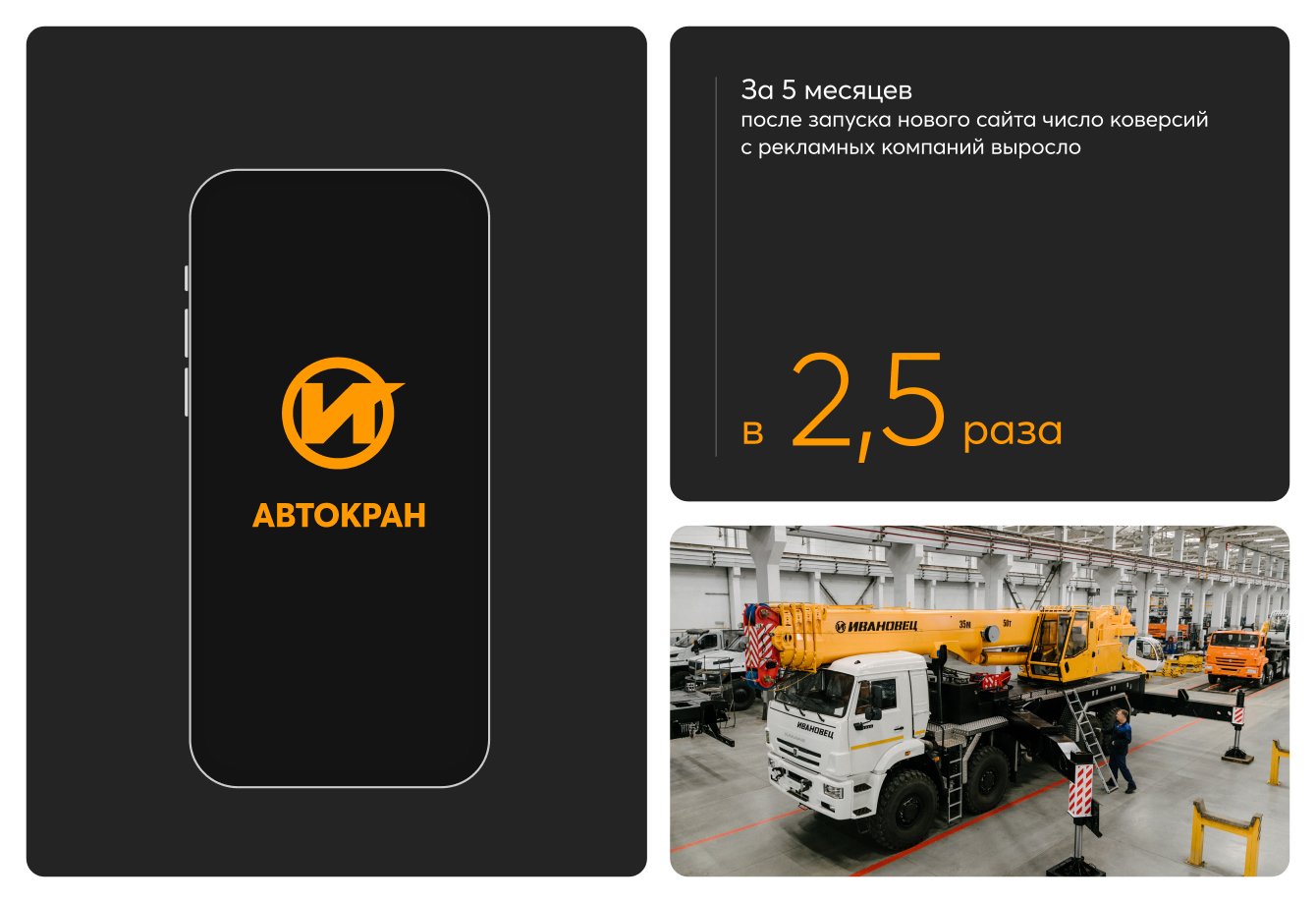 О клиенте: Машиностроительный завод «Автокран» производит автомобильные краны под маркой «Ивановец» грузоподъемностью от 16 до 50 тонн. С 1950 года - даты основания - заводом произведено более 159 тысяч автокранов для 70 стран мира. В дилерской сети «Автокран» 183 партнера в России и СНГ (на конец 2020 года). Сервисную сеть поддерживают 74 представителя в России и СНГ.