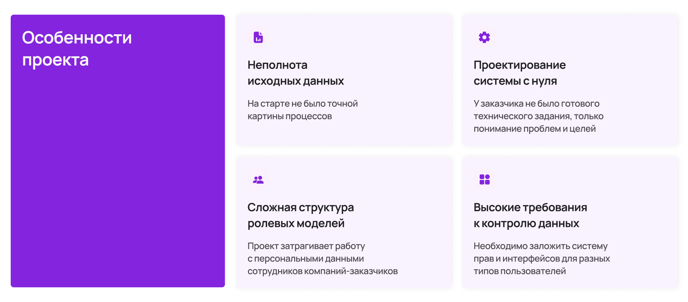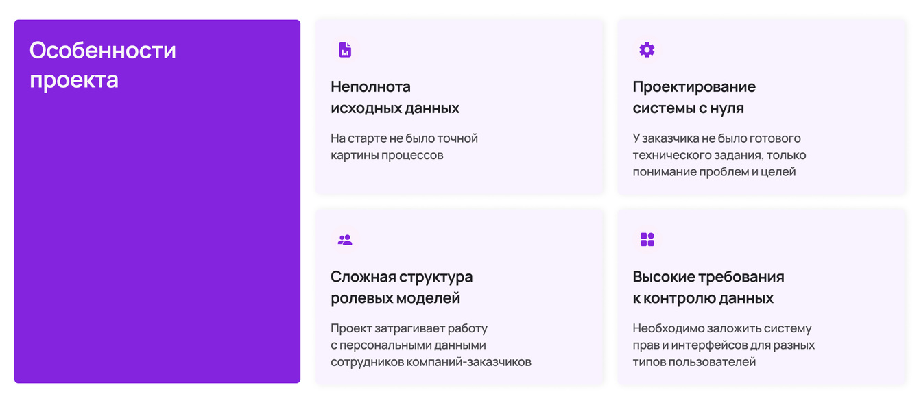 Мы часто встречаем ситуацию когда на старте бизнес хочет в системе всё и сразу. Наша задача — найти только то, что действительно нужно, чтобы система росла и масштабировалась без проблем. Здесь в первоначальном списке были сложные роли с десятью уровнями доступа и ещё десяток функций.