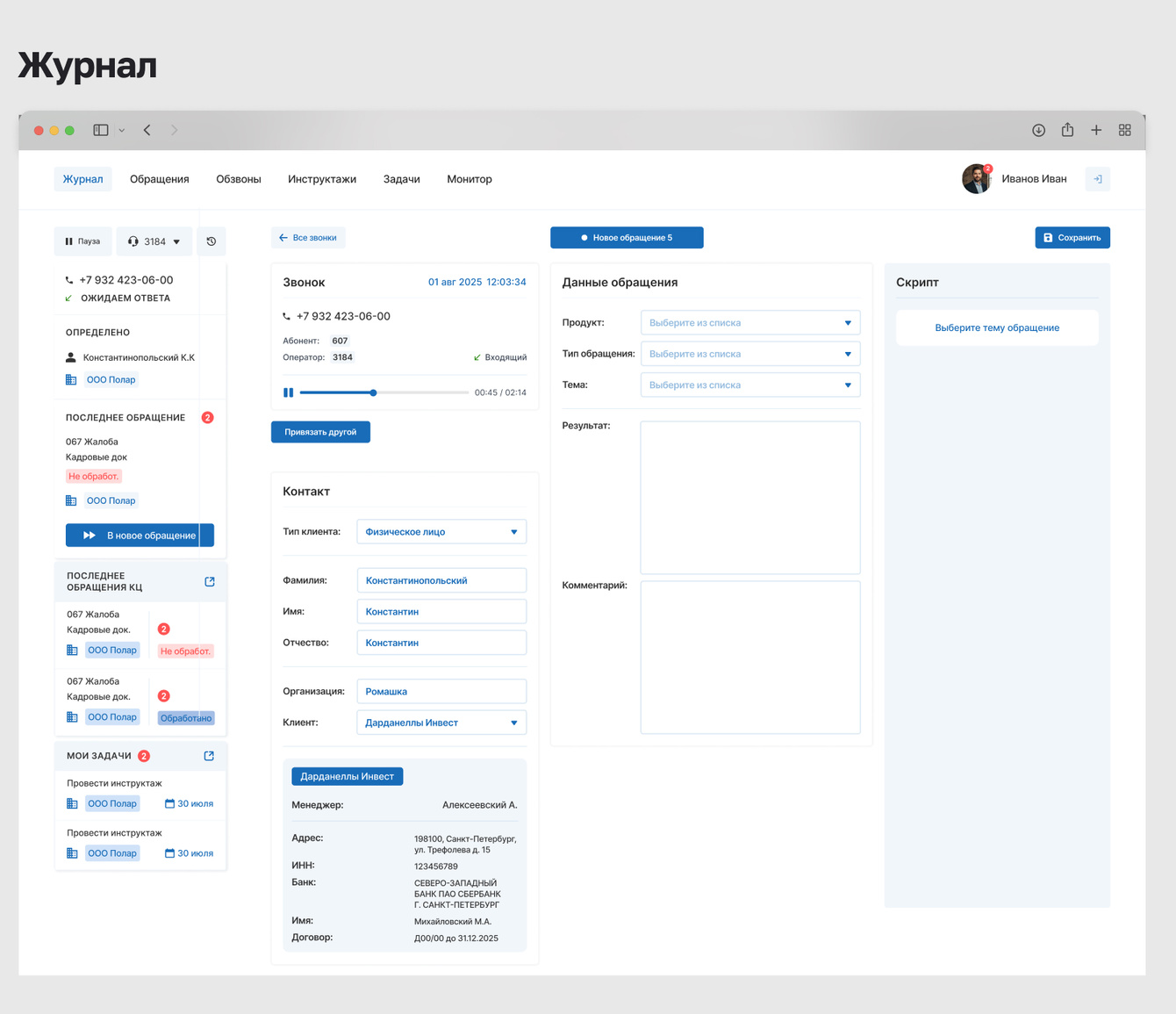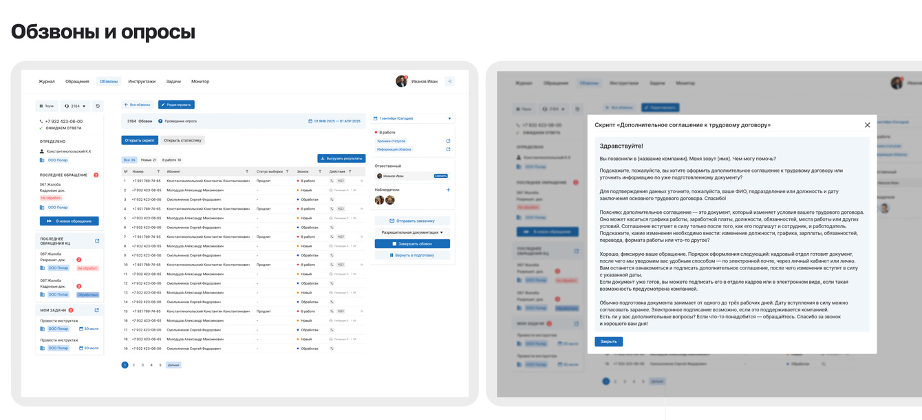 В Журнале оператор видит всё в одном экране: данные текущего звонка, историю клиента, форму обращения и скрипт. Это во многом снижает когнитивную нагрузку, ускоряет обслуживание и делает работу предсказуемой.
