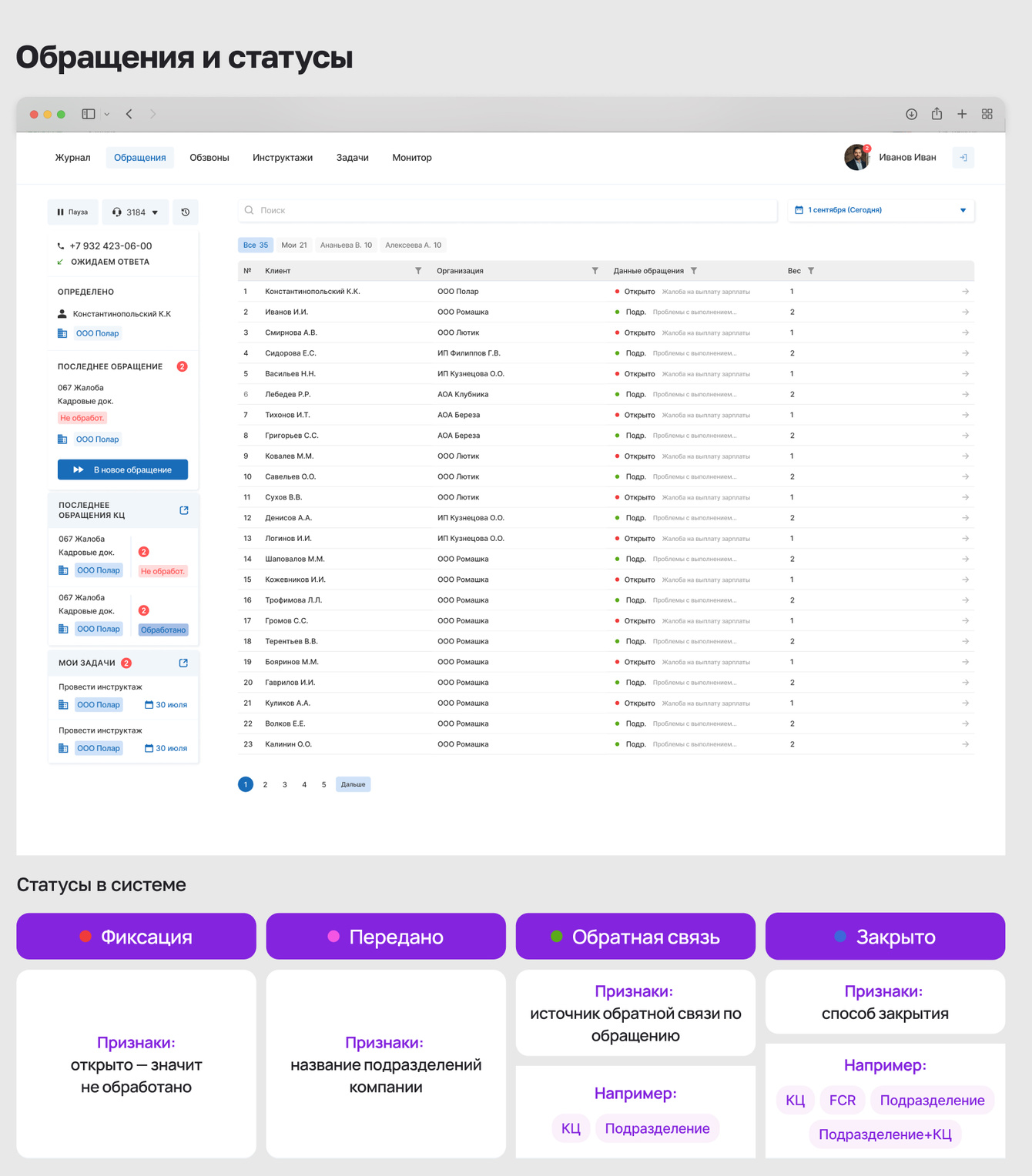 Если оператор не может решить вопрос сам — он передаёт обращение с нужным статусом, и оно остаётся на контроле до финального ответа.