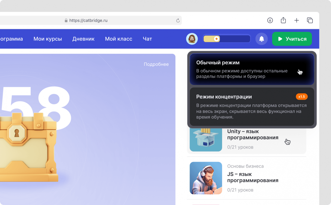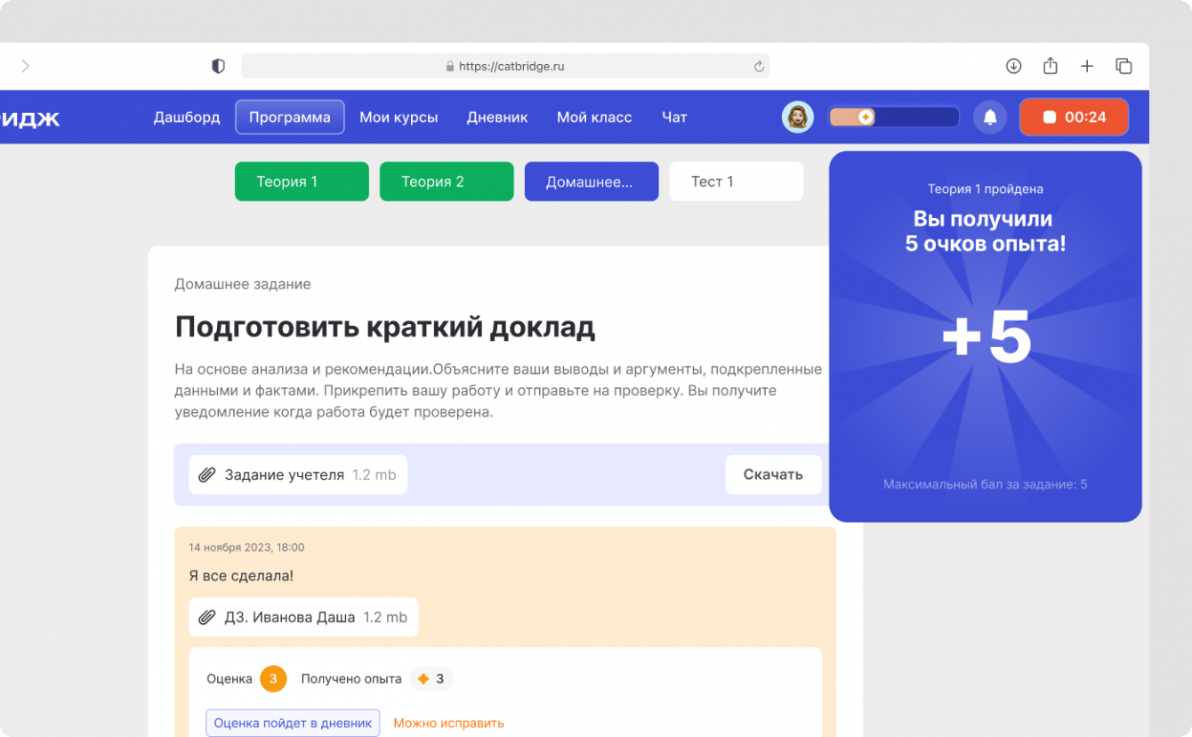 Мы создали онлайн-платформу CLS с элементами геймификации за 6 месяцев. Уникальный режим фокусировки позволяет ученикам глубже погружаться в игровой процесс, а система опыта и достижений вызывает ощущение участия в онлайн-игре.