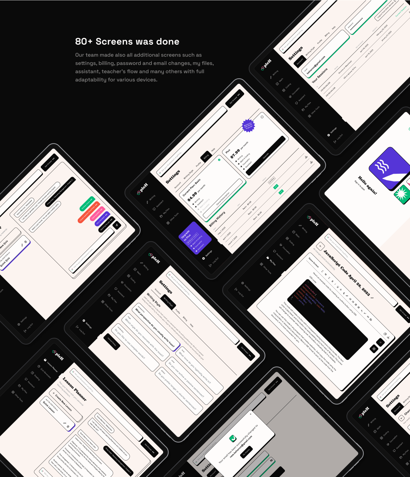 — Наша команда также создала дополнительные экраны, такие как настройки, оплата, изменение пароля и электронной почты, мои файлы, помощник и многие другие с полной адаптивностью для различных устройств. Всего было создано более 80 экранов