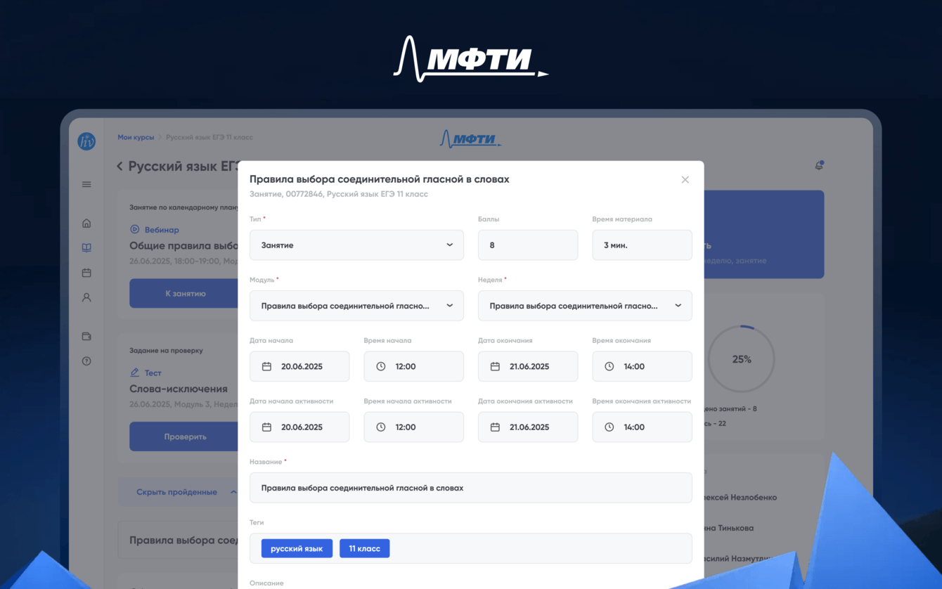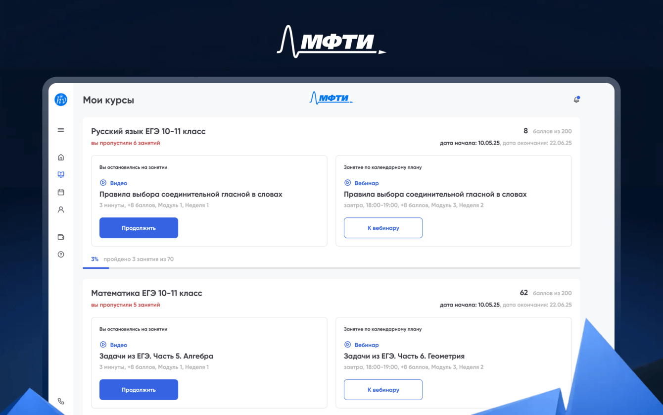 На цифровой платформе школьники могут проходить курсы, участвовать в вебинарах, выполнять задания и отслеживать свой прогресс, системно готовясь к олимпиадам, экзаменам и поступлению в МФТИ.
