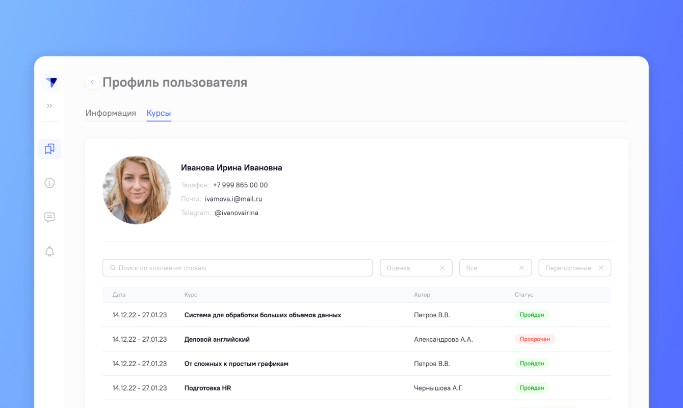 администратор — назначает роли, работает со списком пользователей, настраивает модификации курсов, одобряет или отклоняет пересдачу;