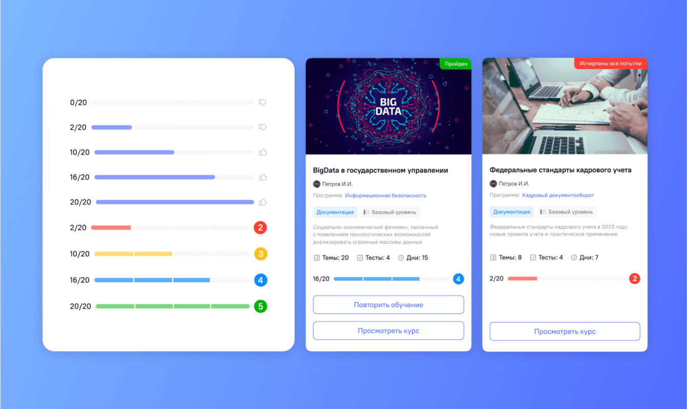 можно быстро интегрировать сервис с другими информационными системами, в том числе для демонстрации статуса обучения.