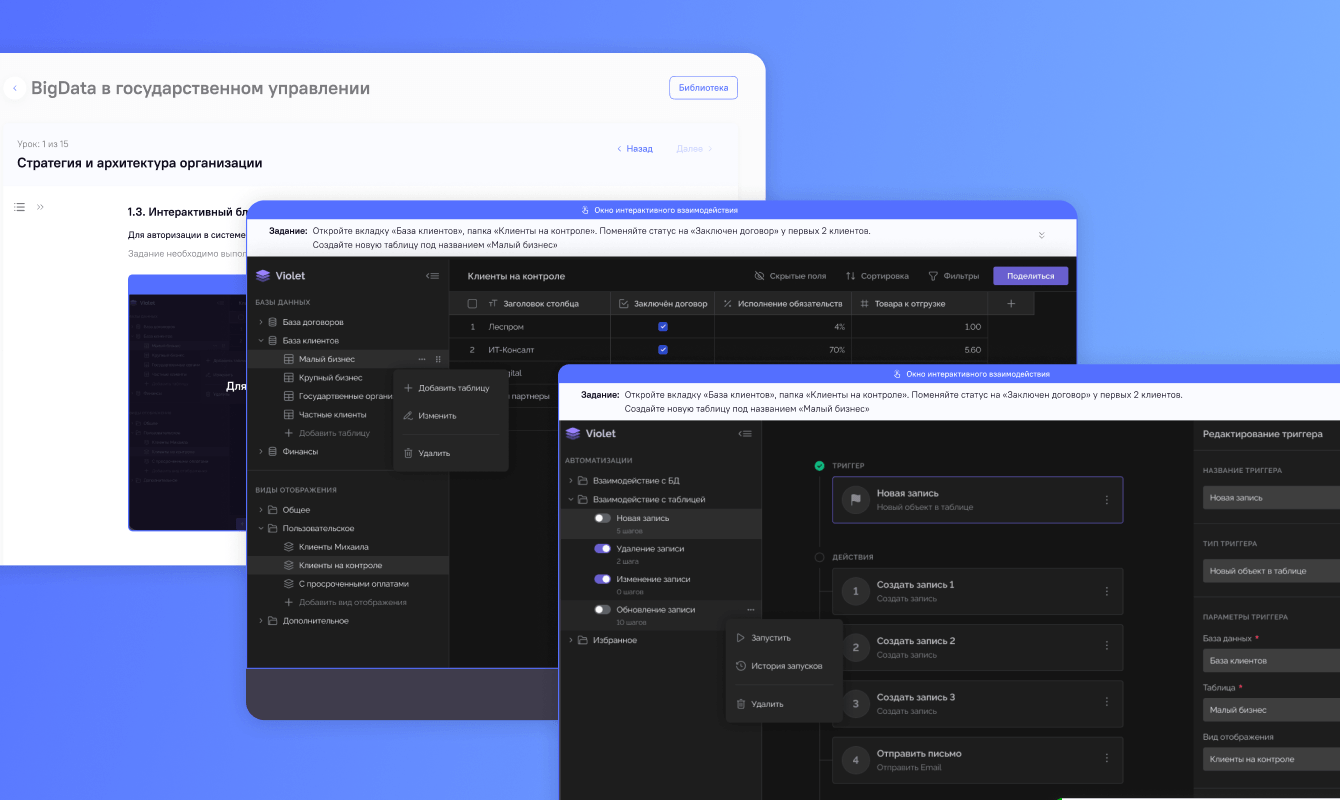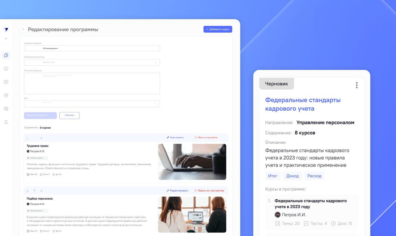 Редактор и администратор могут объединять наборы курсов в полноценные образовательные программы, дополнять постоянно актуализируемые базы знаний и связывать их с материалами и тестами.