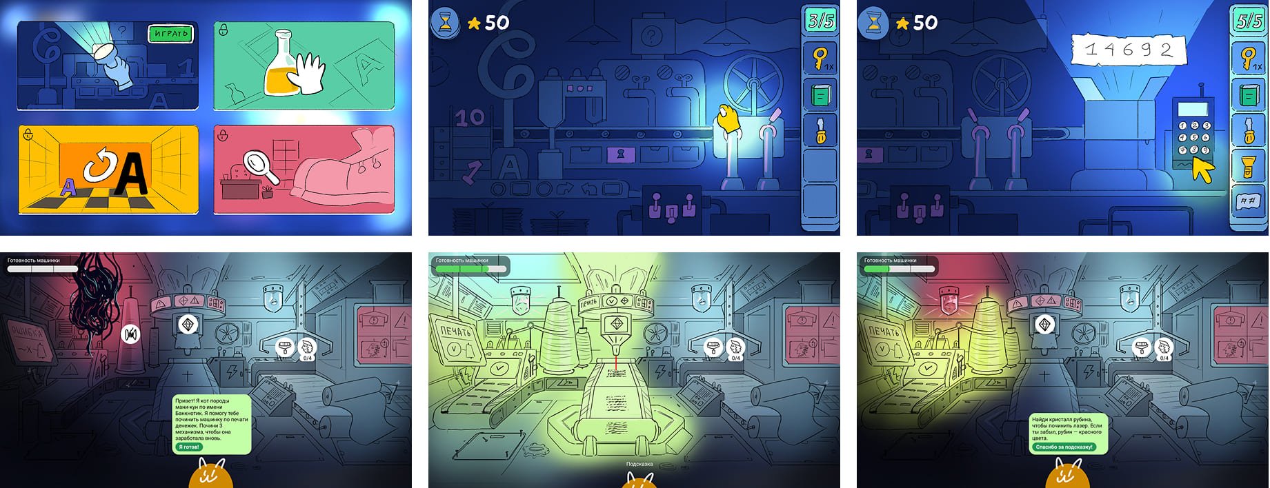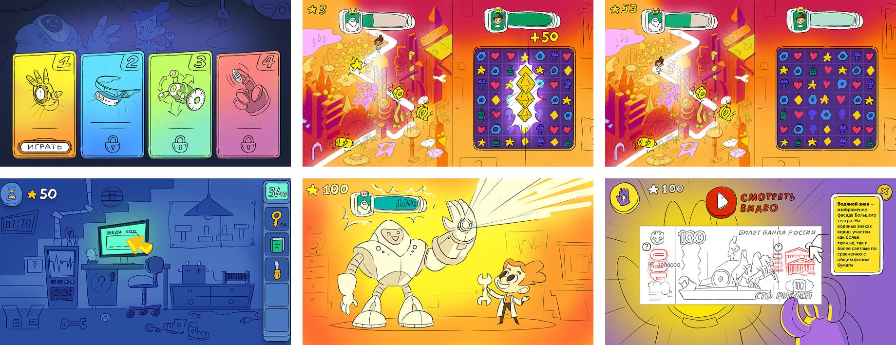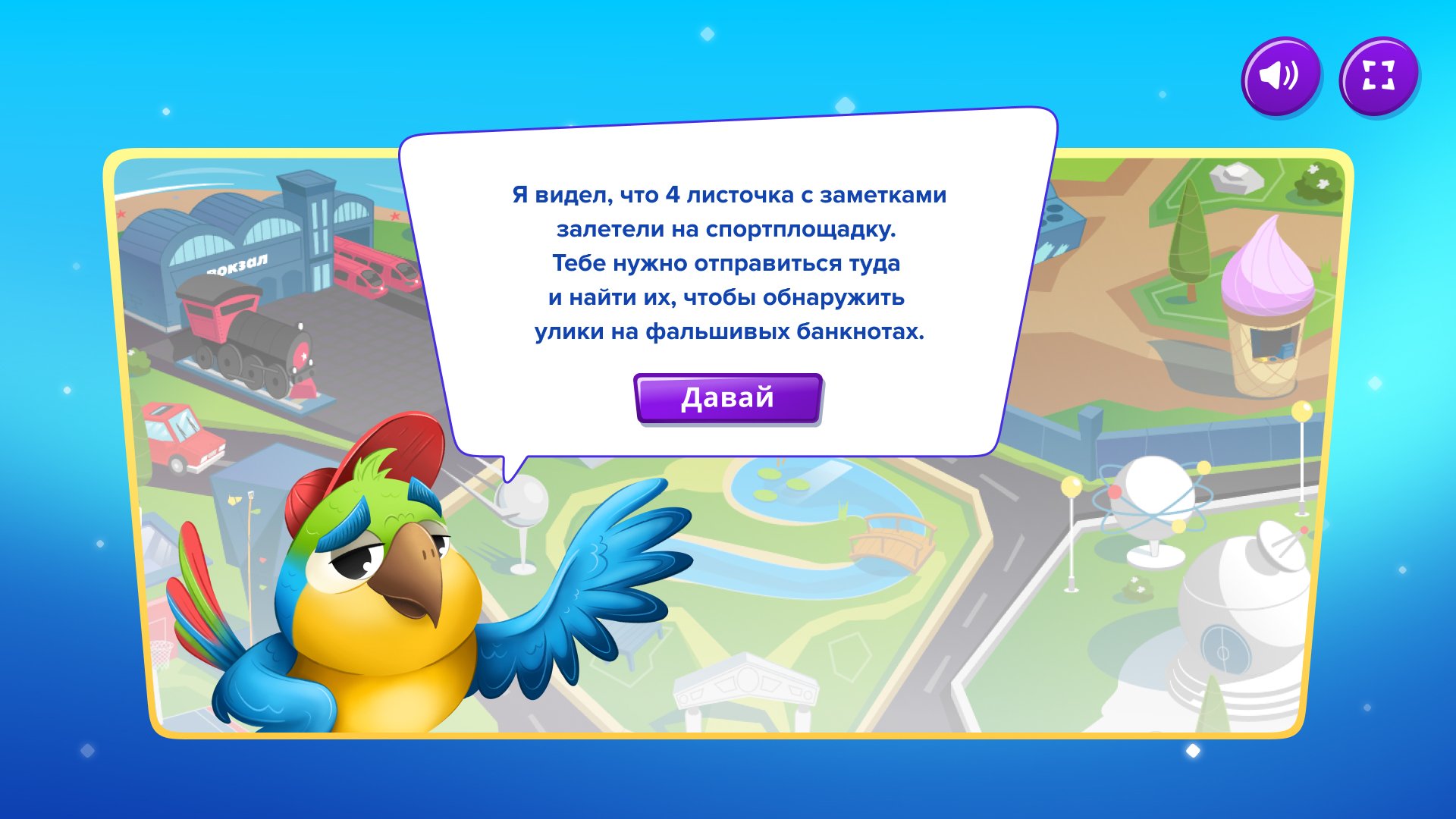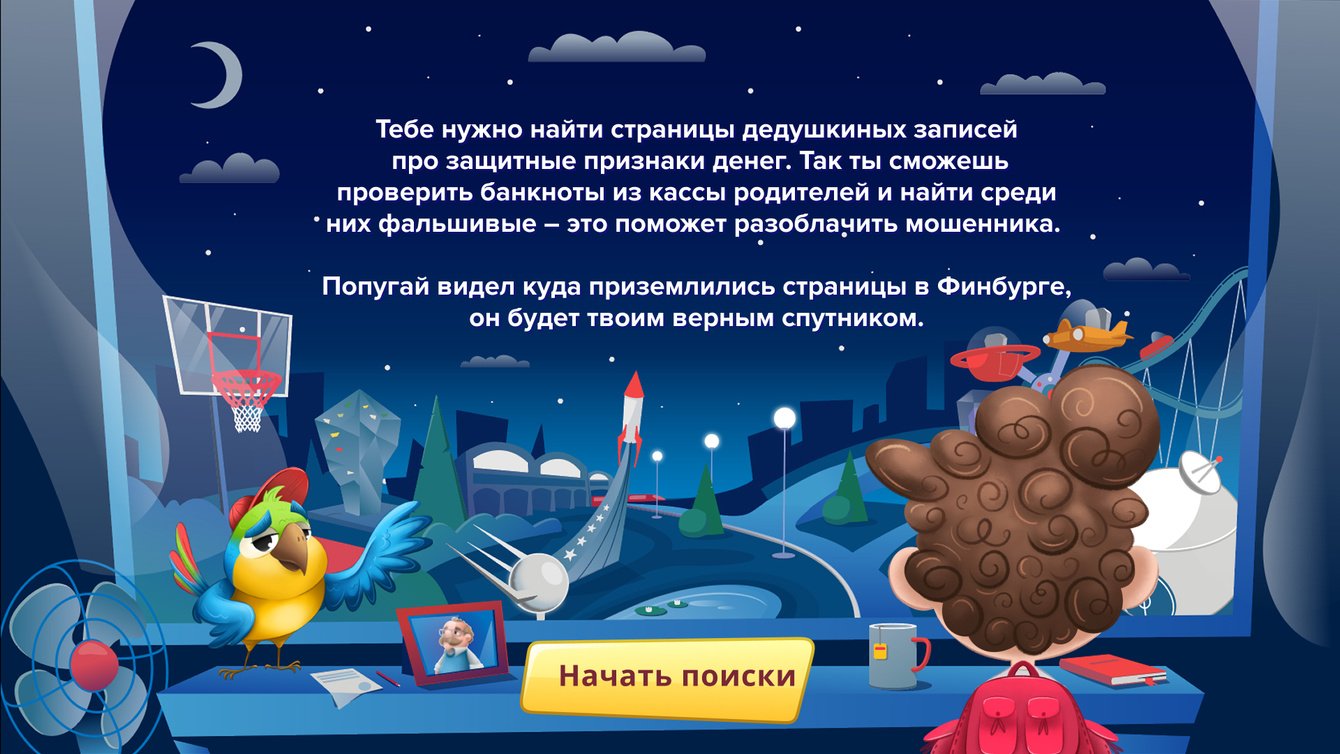 Мы создали эту игру, чтобы научить детей 7-10 лет отличать подлинные банкноты от фальшивых денег. Через игру нам нужно было рассказать школьникам о защитных элементах на бумажных купюрах и познакомить с навыками, которые помогут определить фальшивку.