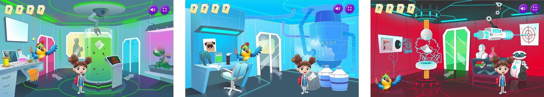 Мы сделали игру в жанре квеста с линейным сюжетом, с понятной и привычной механикой для пользователя. Главные герои игры — мальчик Миша и девочка Маша, которым предстоит найти все подсказки и разгадать все загадки.