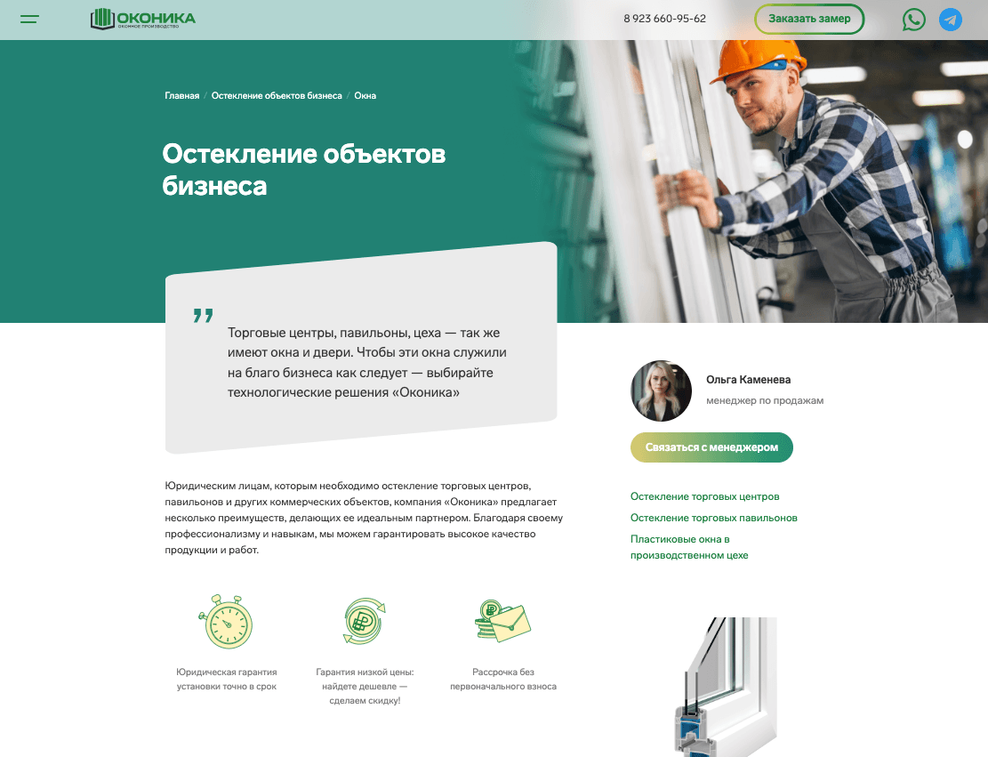 Отдельная часть сайта посвящена работе компании в b2b-секторе. Здесь рассказывается о крупных проектах, которые можно реализовать в сотрудничестве с «Оконикой».